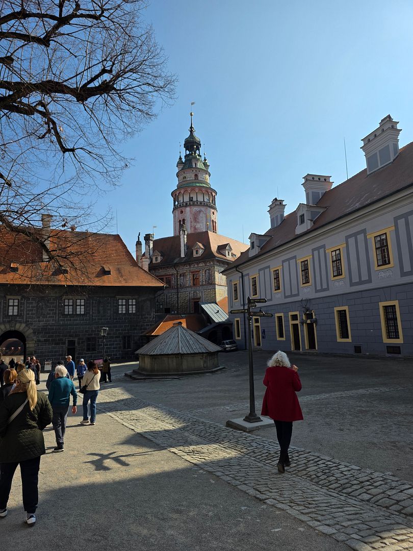 The wind aided temps at this point to drop and we decided to try to find someplace for warmth and a hot drink. We ended up at a counter service for sweets and decided on hot chocolate for our drink and a couple sweets for the road. Heading back to the square we saw St. Vitus church and decided to climb up the stairs for a visit.