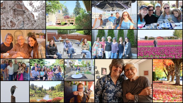 May in California for Pop’s 94th birthday, Washington tulips, cherry blossoms, Japanese Garden, Magnuson Park, Mother’s Day, Father’s Day, summer visits from nieces and nephews and sisters, birthday parties, fall colors.
