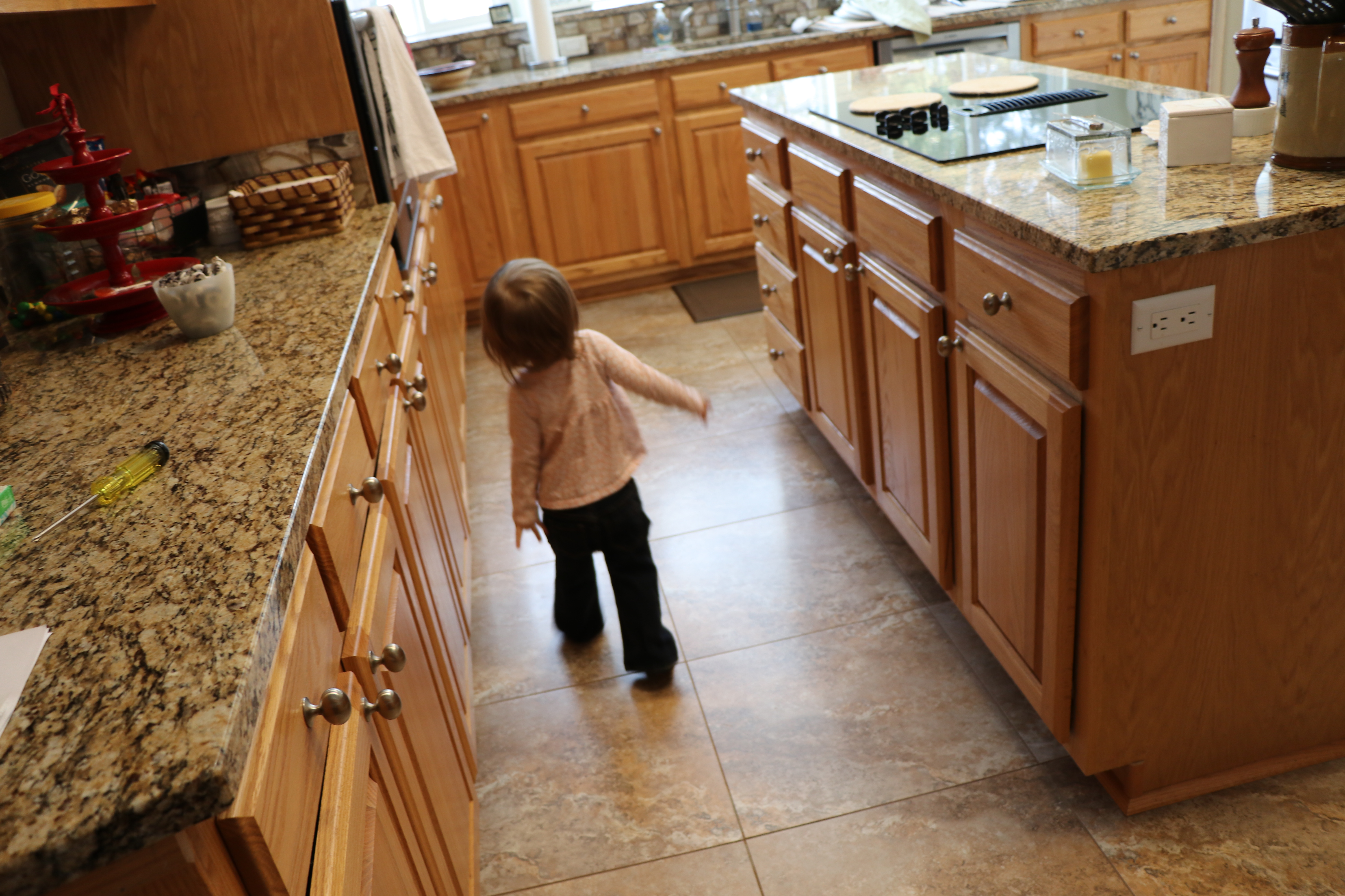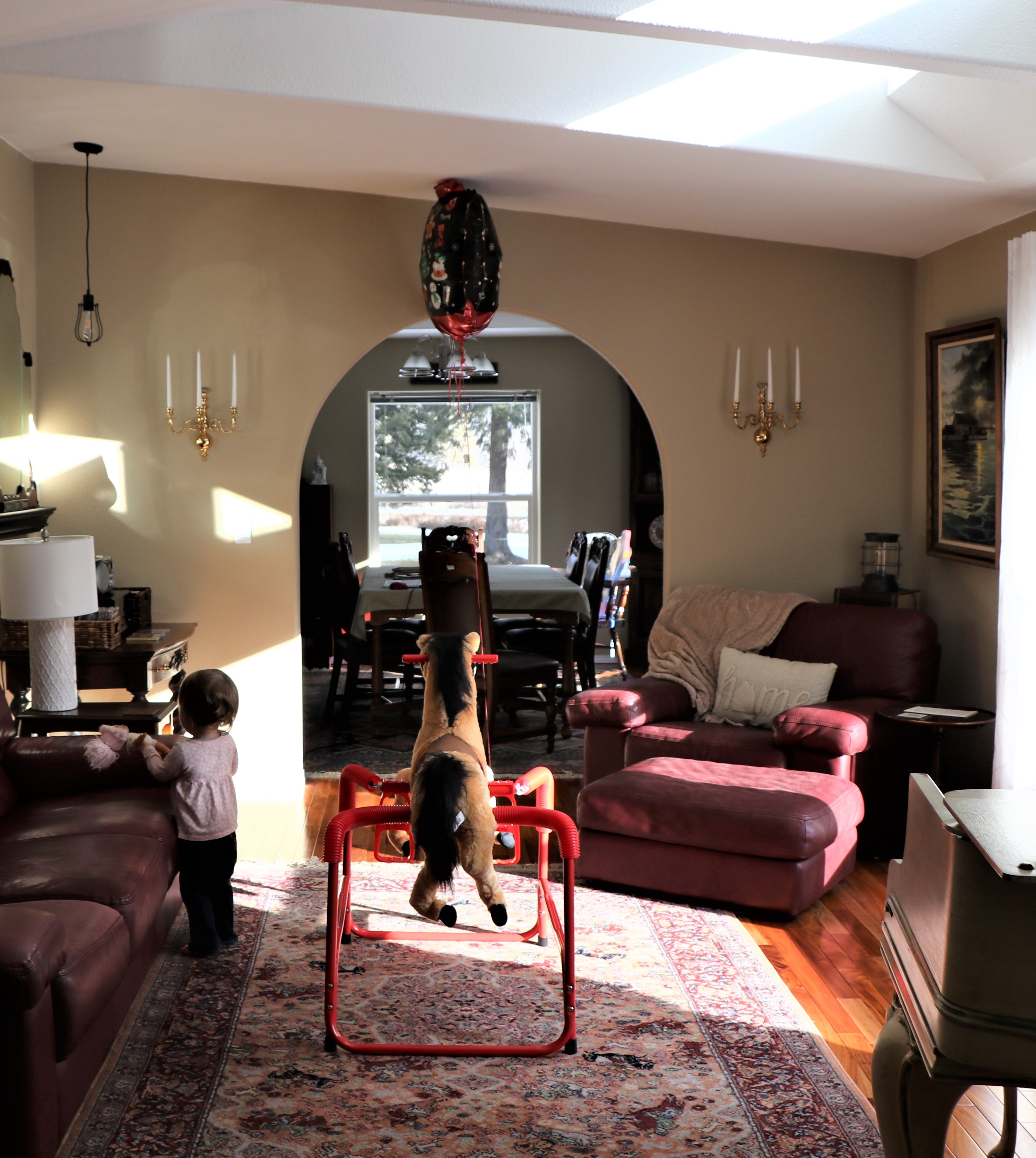 Addy is learning the lay of the land at Baba and Gramps’ house.