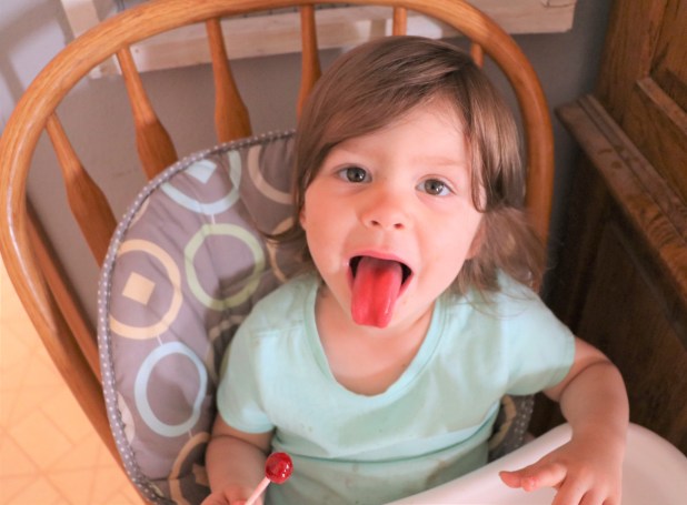 After lunch Addy got to choose one small lollipop to enjoy. She got a stash of candy from the Kettle Falls Parade this past Saturday. Her first experience with candy galore! She wanted to see her red tongue so Dear took this photo of her.