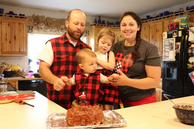 For Jaymison’s re-do party his parents served brunch with pancakes, waffles, bacon, little smokies, and his Granny and Addy made a pull apart Monkey Bread for his birthday cake.