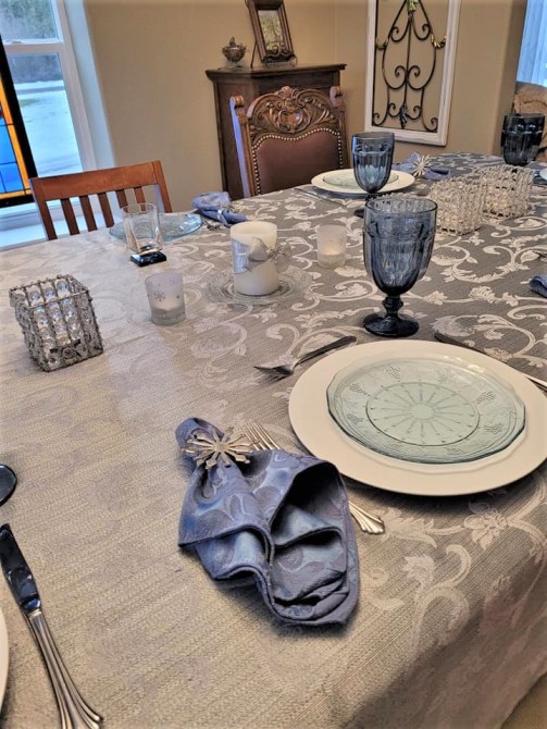 What a gorgeous table setting. I love the blue. Now I am hosting my grandsons’ January birthdays and, believe me, there’ll be no beautiful table setting, Pizza boxes and soda bottles will be the decor. 😊
