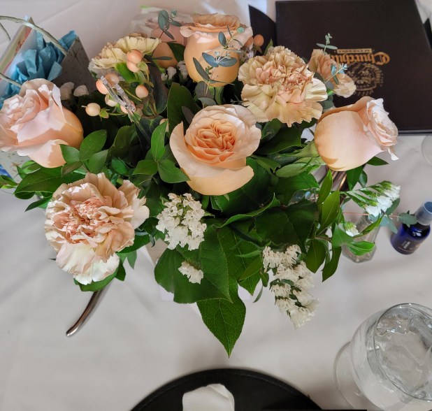 Reading the card I was so surprised to see that they were from Lovella all the way in Canada. She arranged with our daughter in law to have them delivered to the restaurant by a local florist. A very sweet and thoughtful surprise. Thank you, Lovella.