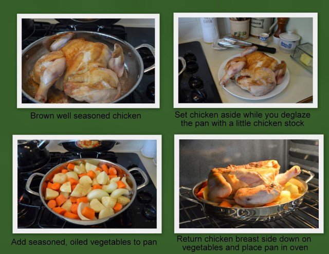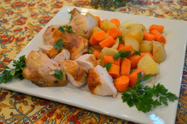 Remove the chicken from the pan onto cutting board and cut the chicken into serving sizes. You can return the chicken to the roasting pan or onto a platter at this point adding the vegetables.