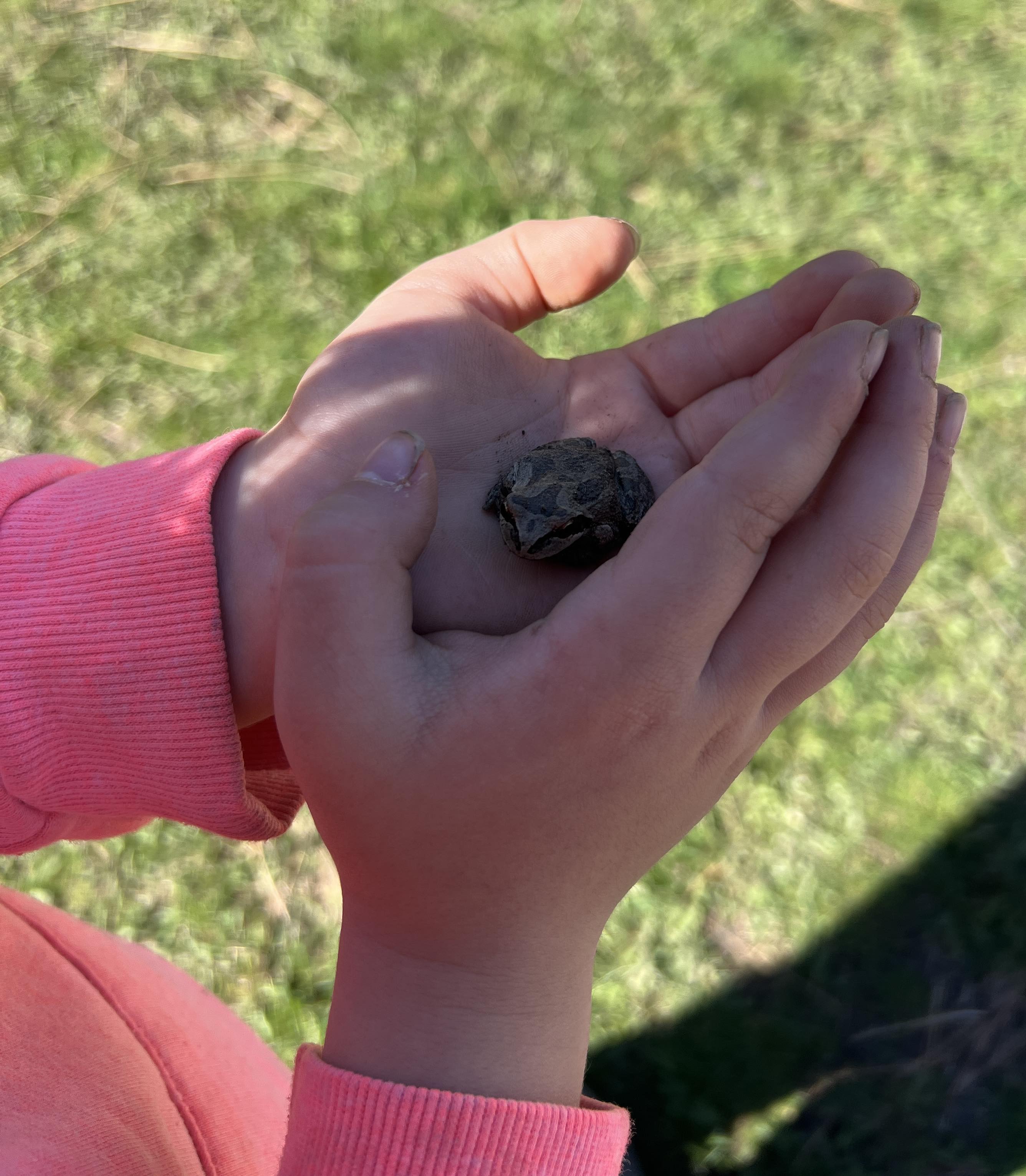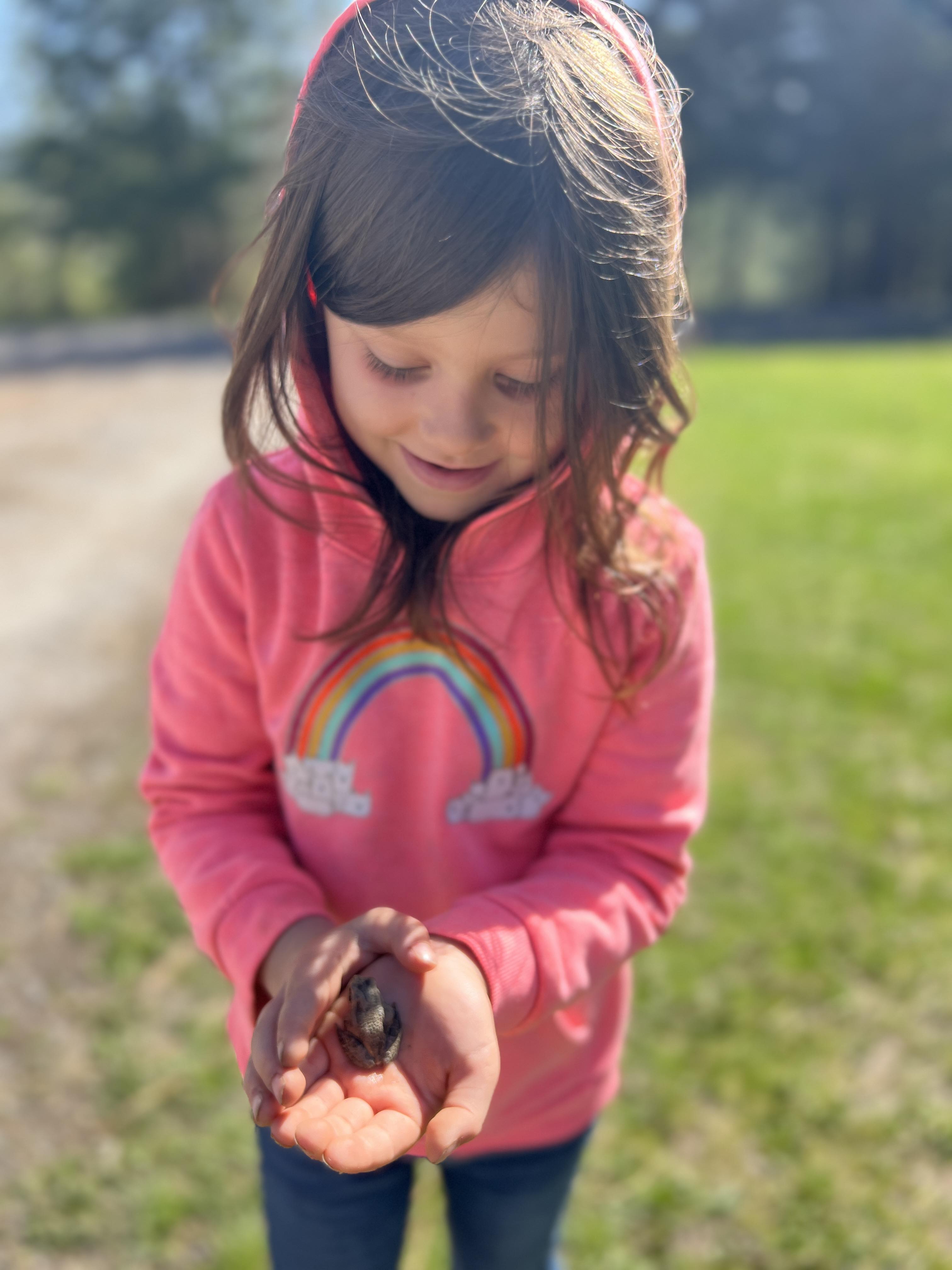 Addy was very excited to show Auntie Lolo the frog or whatever they are called when they are this small. They may be small but they fill the night air with their songs in Spring. It can be deafening.