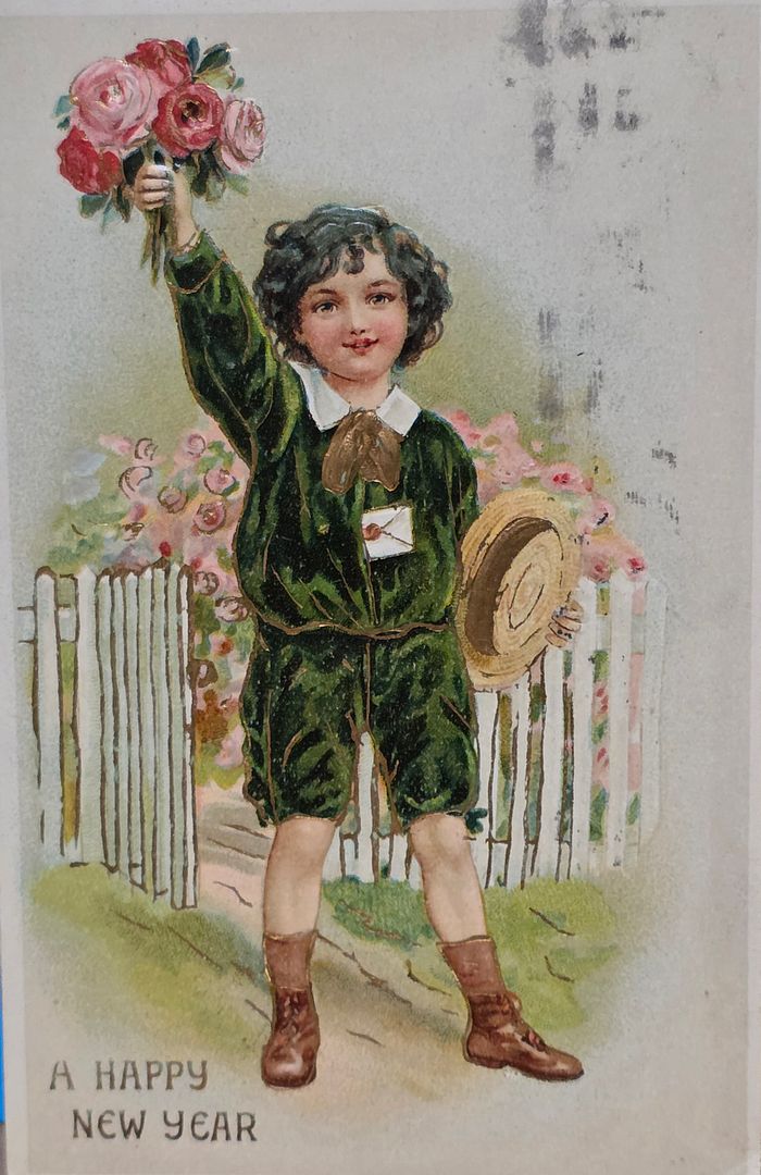 This is my Happy New Year Post for Hodgepodgers. This post card was sent to Greg’s Great Great Aunt Emma. The card was sent from Chicago to Denver in 1906! It is a hundred year old Happy New Year greeting! The stamp was one cent. The written greeting is in Swedish.