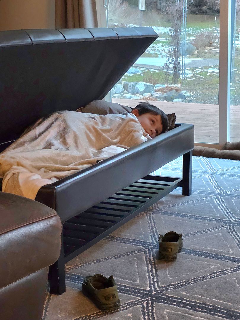 FUN pictures! Interesting hair transformations! Clever of JJ to recline inside the ottoman!