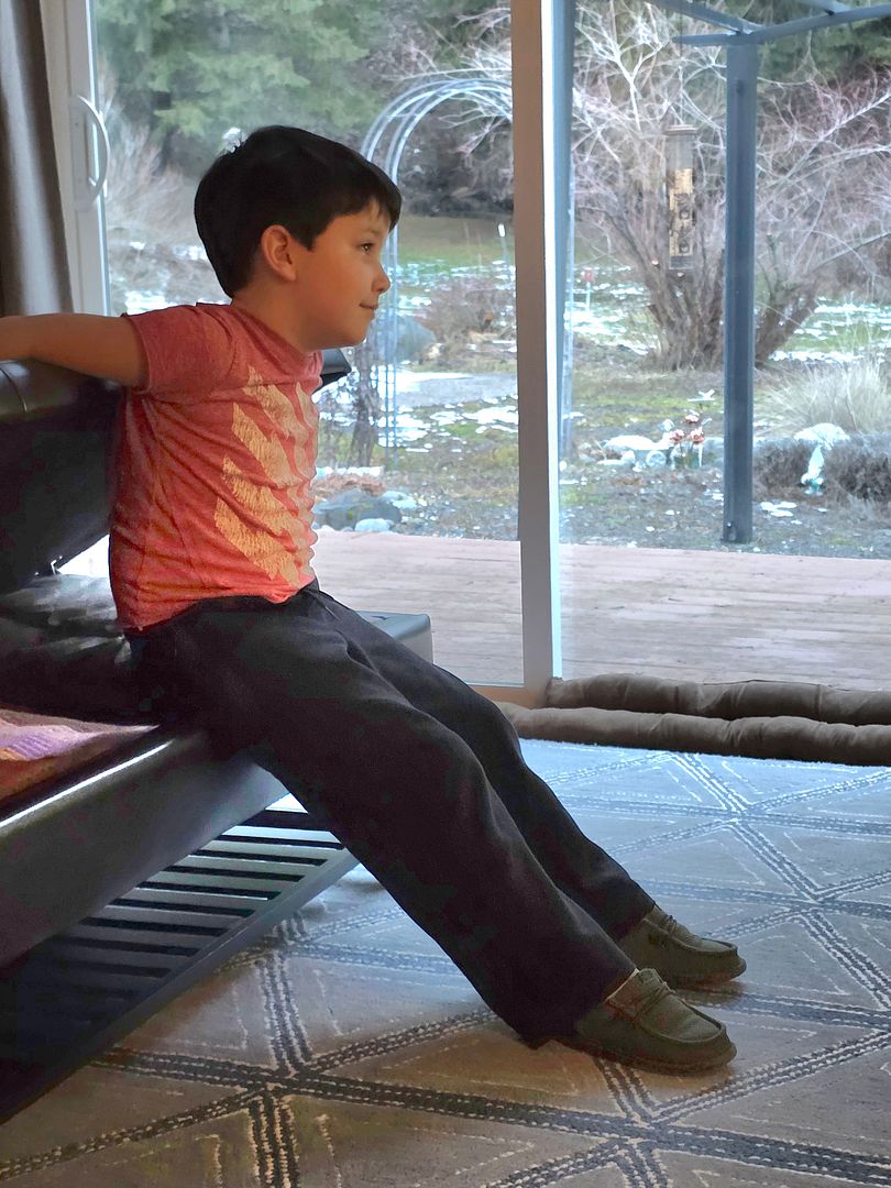 He found that our family room ottoman was just the right size for a cozy spot to watch TV.