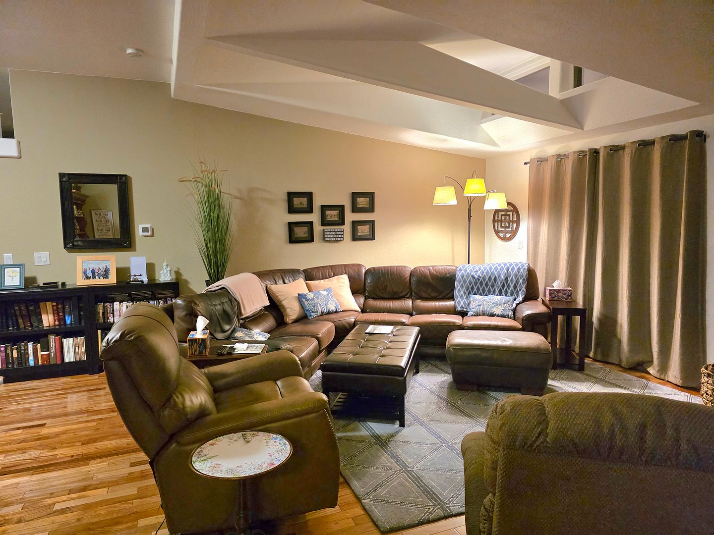 Soon I’ll take a daytime photo, too, and add it to this post. This past weekend we decided to do a little jimmying of our furniture to see how we’d like it. Of course as soon as the huge heavy sofa was moved, the rug had to be moved, tables had to be moved, lights had to be moved and wall art went to more suitable locations.