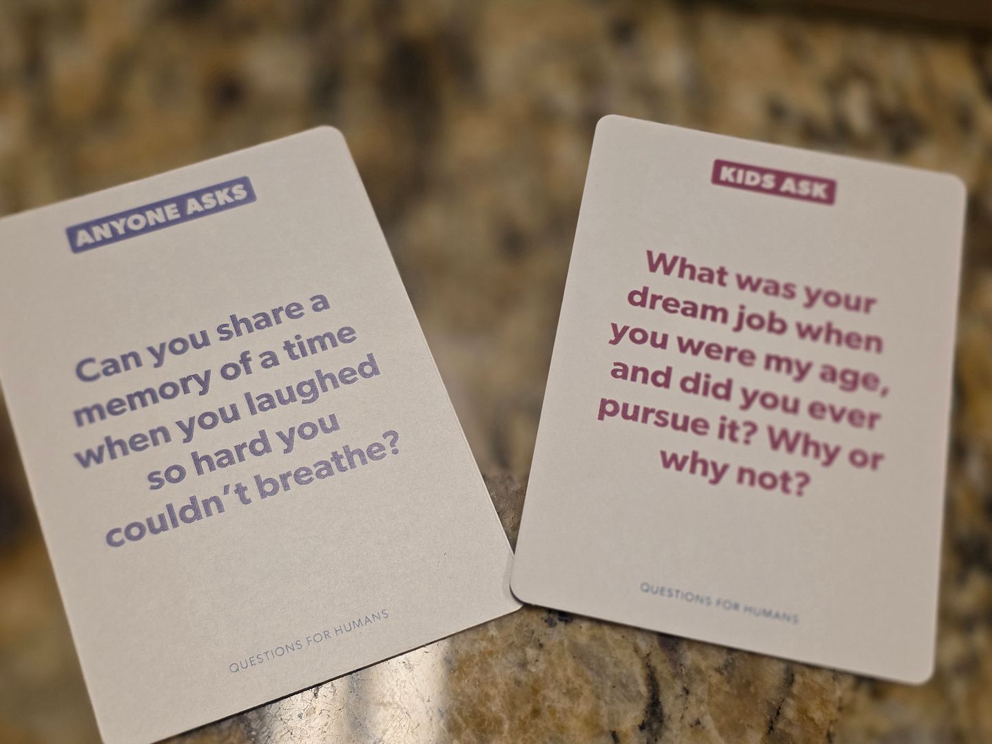 Have you seen these conversation starters. Our kids bought us this set for Christmas. They have the Parents and kids edition and have enjoyed it so much they bought us the Grandparents & Kids set.