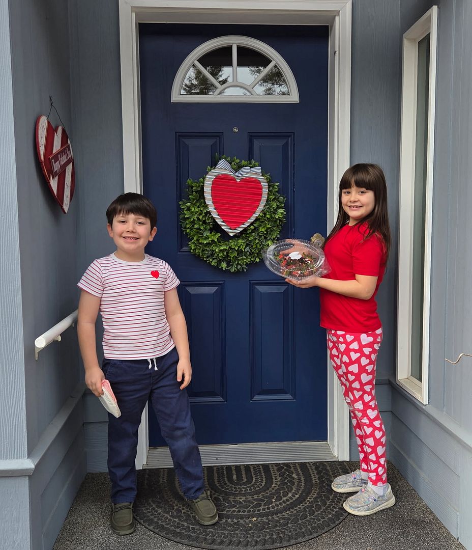 On Valentine’s Day, these two cuties arrived at our door with their mom to deliver some Chocolate Covered Strawberries. They were making the rounds to their loved ones. So very thoughtful. They were delicious.