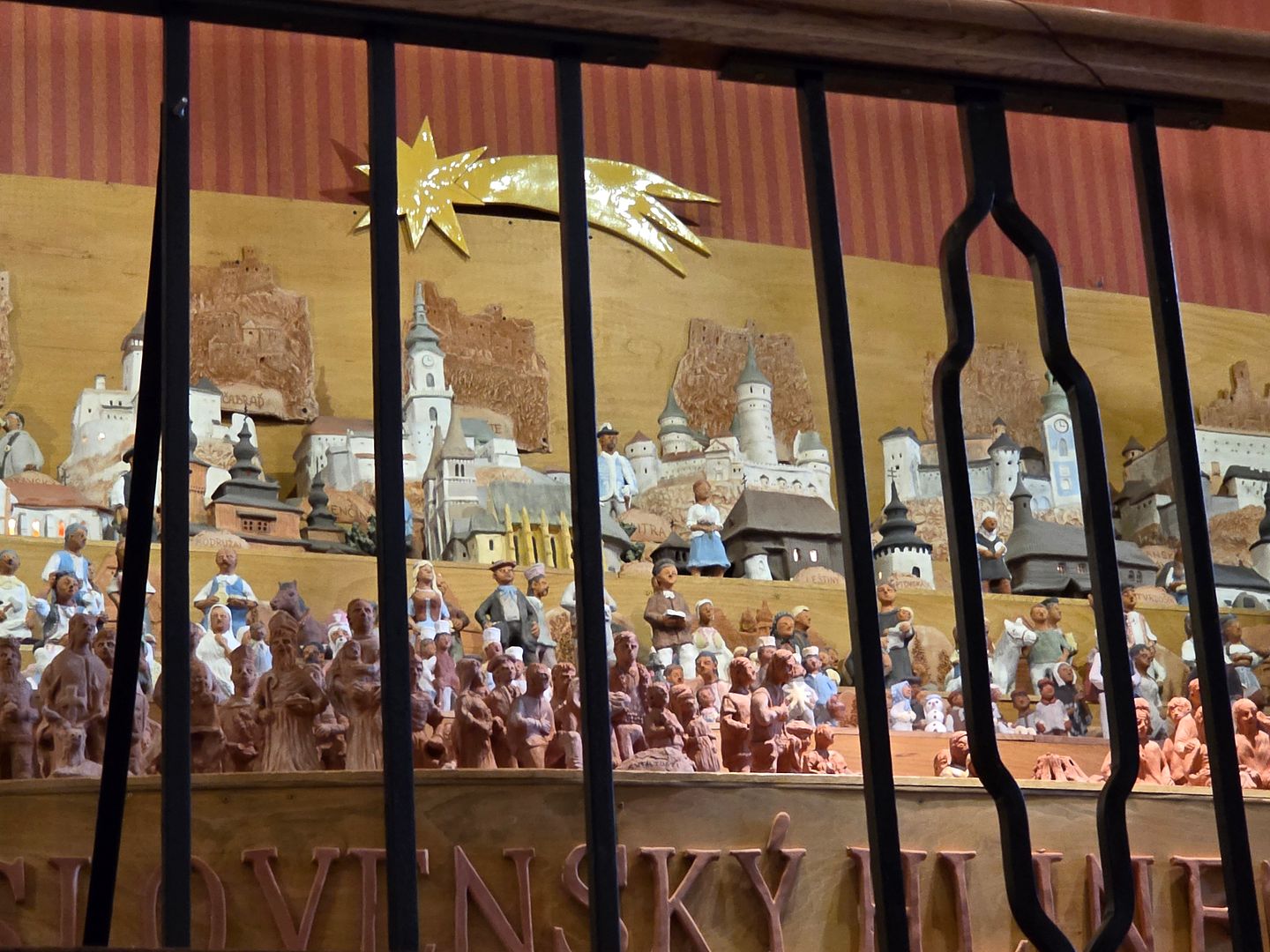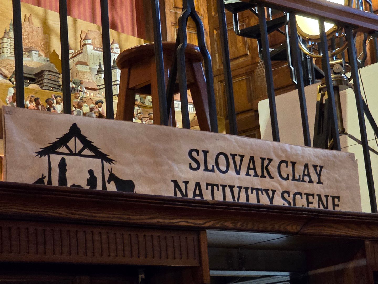 We sat in this space next to the bar below at a community table. This part of the building was a theater. It also has history as being a hospital at some point in time. On what was possibly the stage of the theater is a huge clay model of Bethlehem.