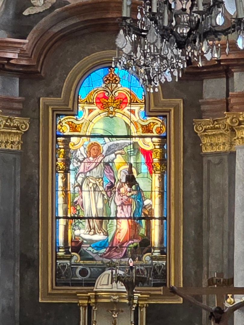 Stained glass window depicting the Annunciation, The Angel Gabriel foretelling the birth of Jesus to Mary.