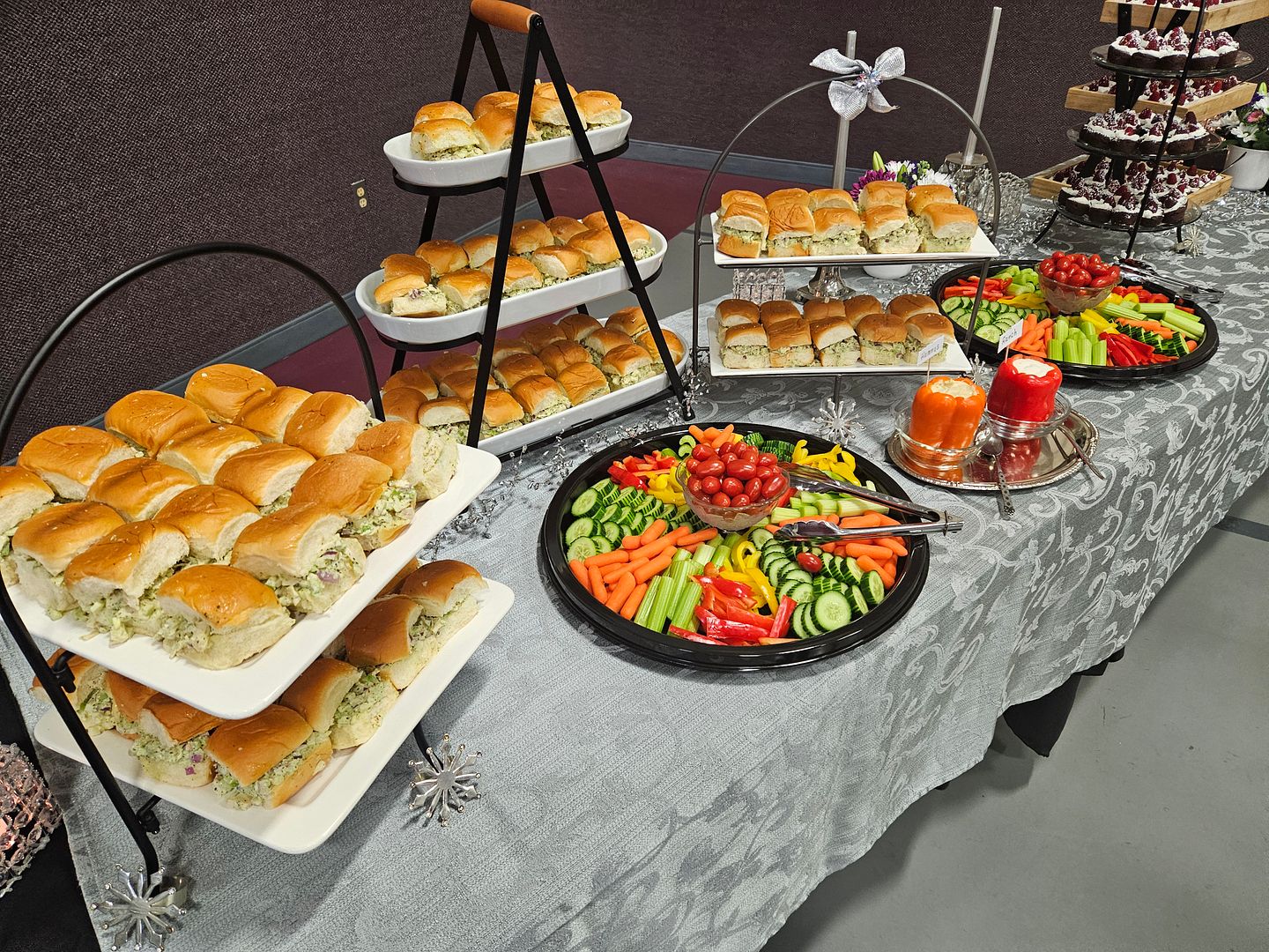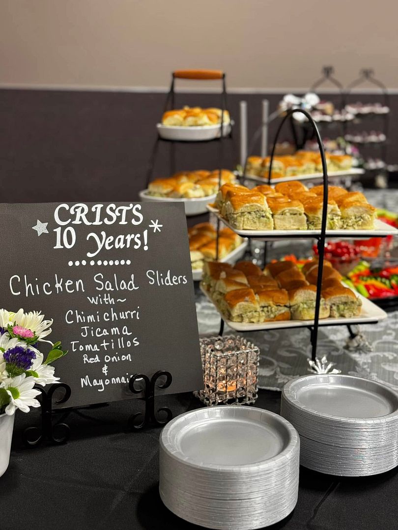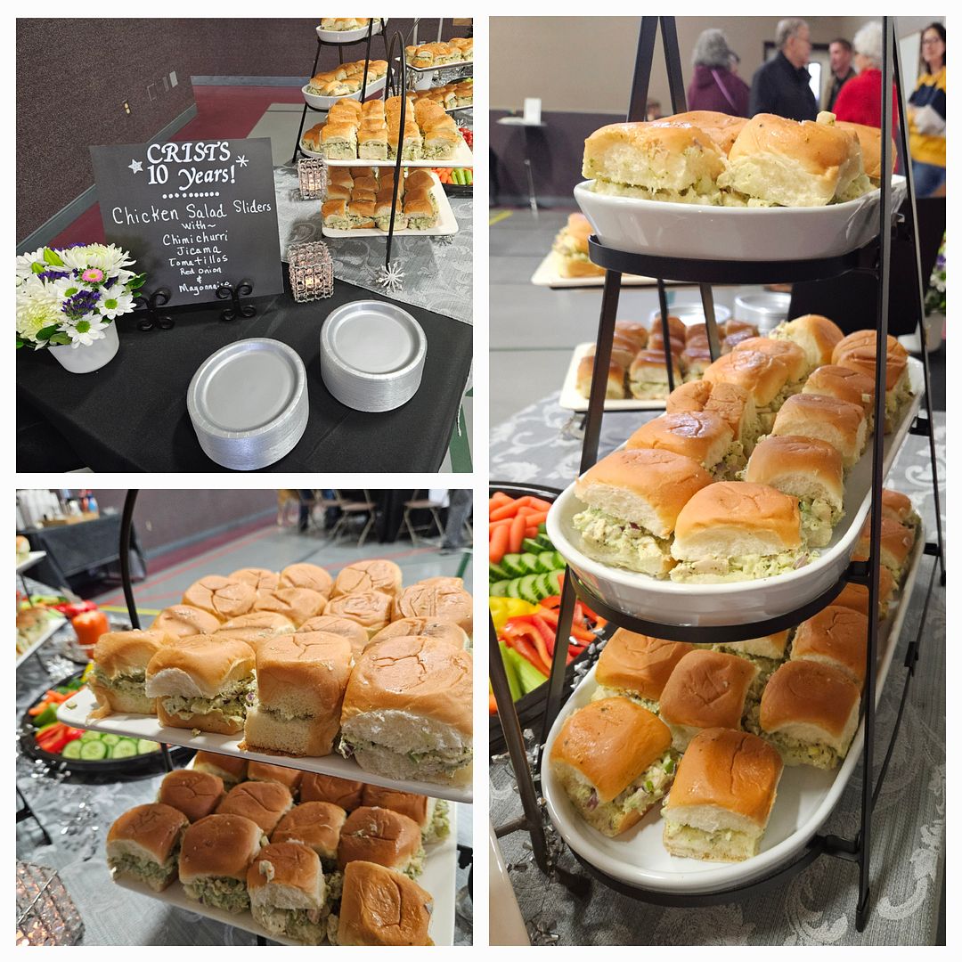 Volunteers were enlisted for three shifts of service. My first 5 shift volunteers from 1pm until 4pm did all the peeling, chopping, mixing, slicing, stuffing, frosting, arranging and clean-up for West Coast Chicken Sliders, Veggie platters, and elevated brownie bites. Once the sliders were stuffed they were stacked in stainless pans between waxed paper and stored in the refrigerators for the event. Before the volunteers arrived I staged the serving tables with tiered servers and some sparkly accents and candles. My second shift of volunteers had the task of keeping the buffet tables stocked with the goodies we prepared. Husband, Greg, was in charge of the water and coffee. We had a third shift of two families who were in charge of the final clean-up, putting away tables and chairs and taking out the trash. The first two shifts of volunteers kept the kitchen clean-up to a minimum washing prep items as we went along. What a fabulous crew.