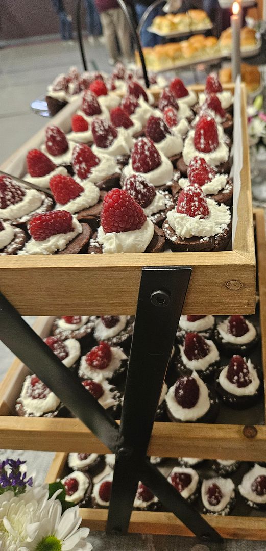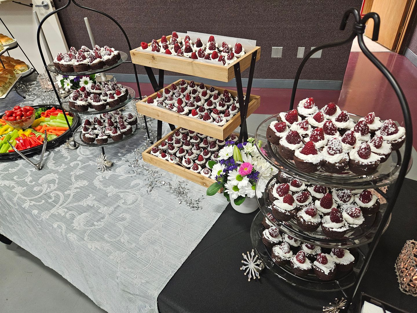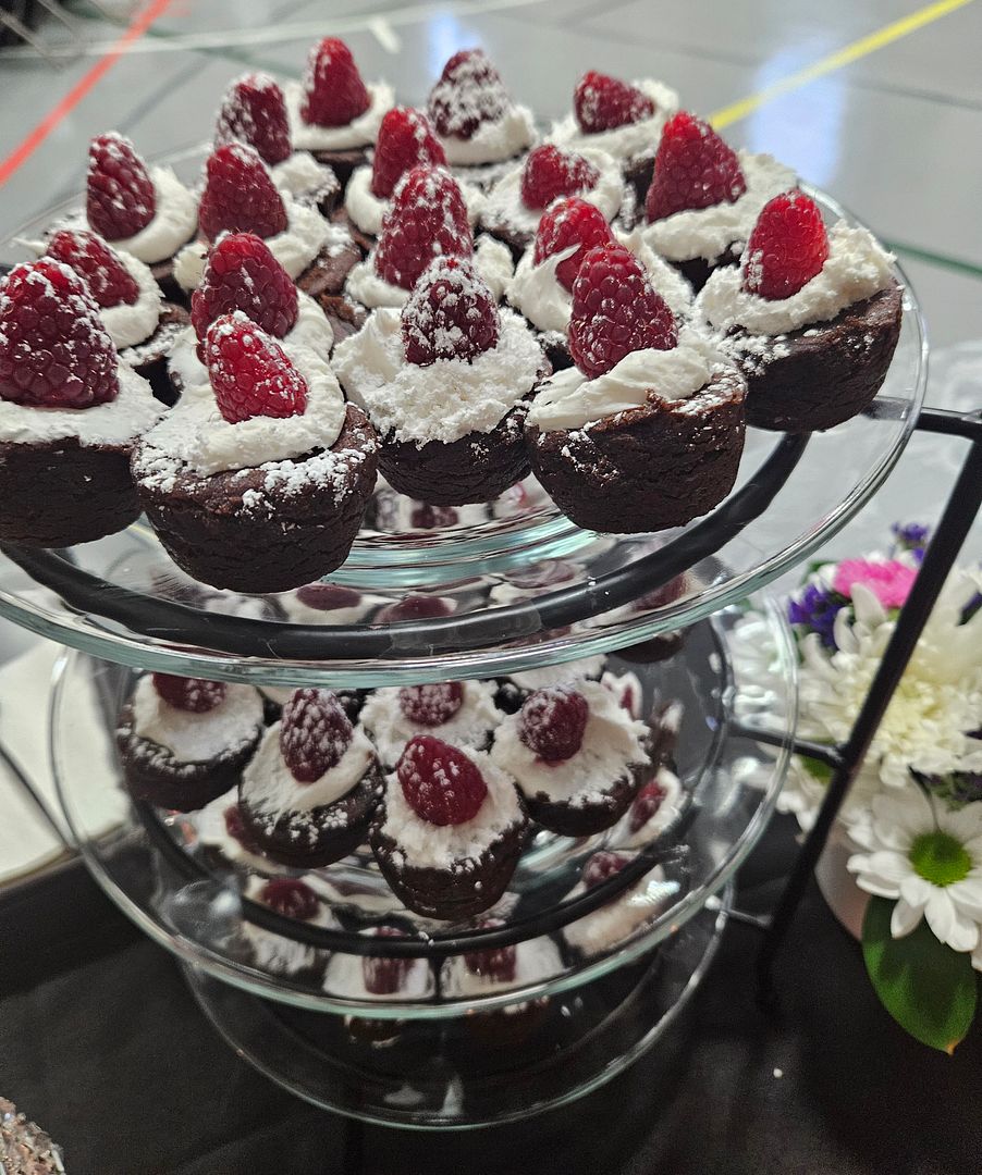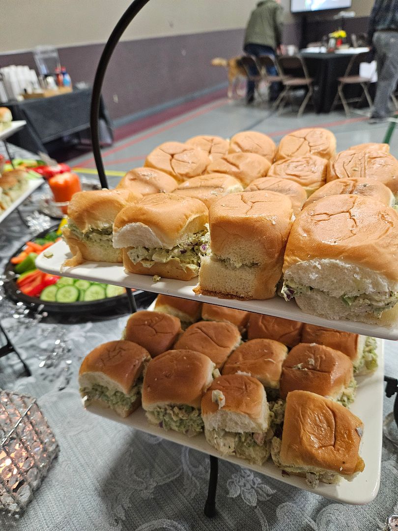 Volunteers were enlisted for three shifts of service. My first 5 shift volunteers from 1pm until 4pm did all the peeling, chopping, mixing, slicing, stuffing, frosting, arranging and clean-up for West Coast Chicken Sliders, Veggie platters, and elevated brownie bites. Once the sliders were stuffed they were stacked in stainless pans between waxed paper and stored in the refrigerators for the event. Before the volunteers arrived I staged the serving tables with tiered servers and some sparkly accents and candles. My second shift of volunteers had the task of keeping the buffet tables stocked with the goodies we prepared. Husband, Greg, was in charge of the water and coffee. We had a third shift of two families who were in charge of the final clean-up, putting away tables and chairs and taking out the trash. The first two shifts of volunteers kept the kitchen clean-up to a minimum washing prep items as we went along. What a fabulous crew.