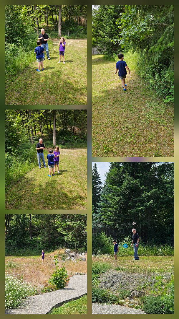 On Thursday there was time on our acreage to see what they could discover. Gramps taught them how to whistle using a blade of grass. There was some sprinkler fun and hammering stakes in the ground. Lunch was an interesting combination of eggs, turkey sandwiches, a pancake, applesauce, sour cream and real maple syrup.