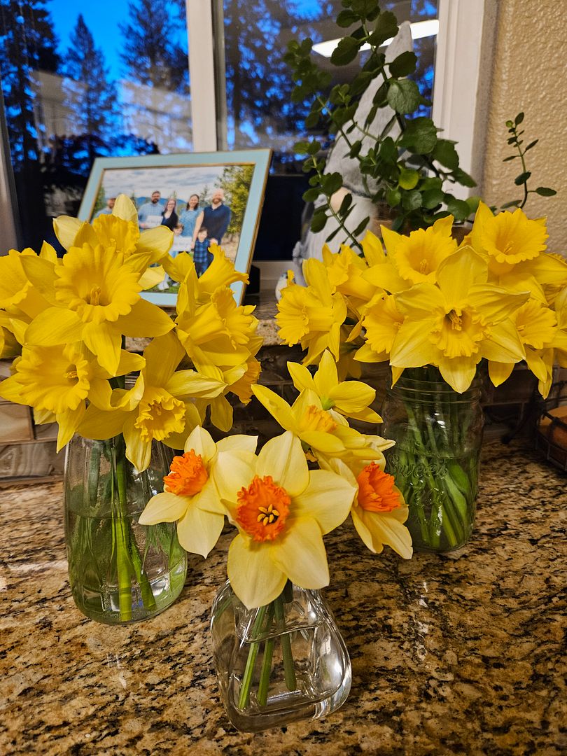 These are store bought but pretty soon daffodils will make their blooms known in our yard.