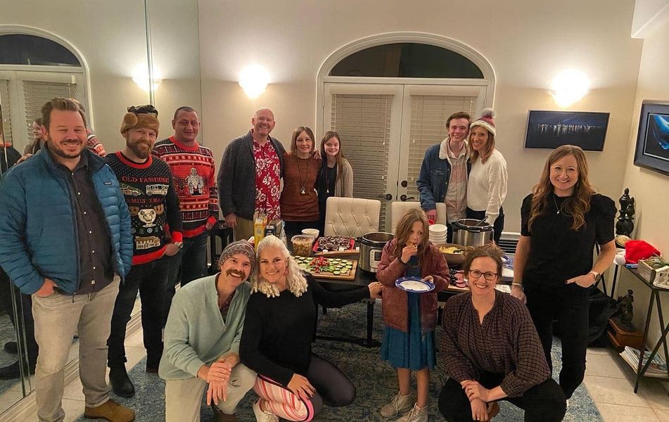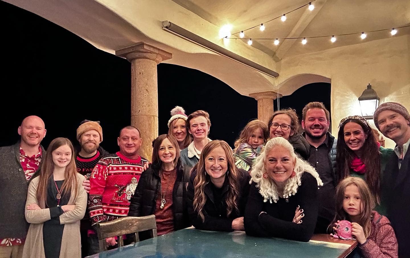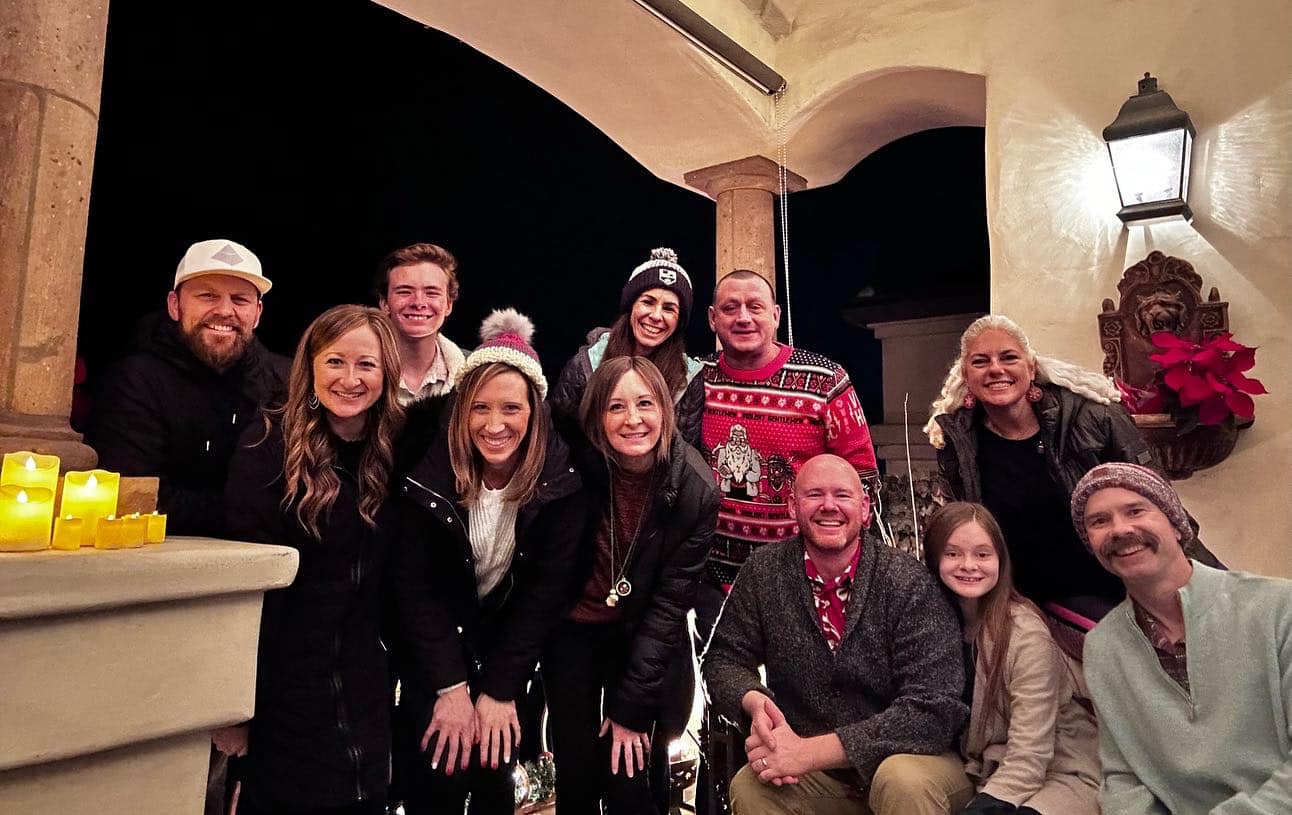 A fuzzy night time photo of all 15 of us!