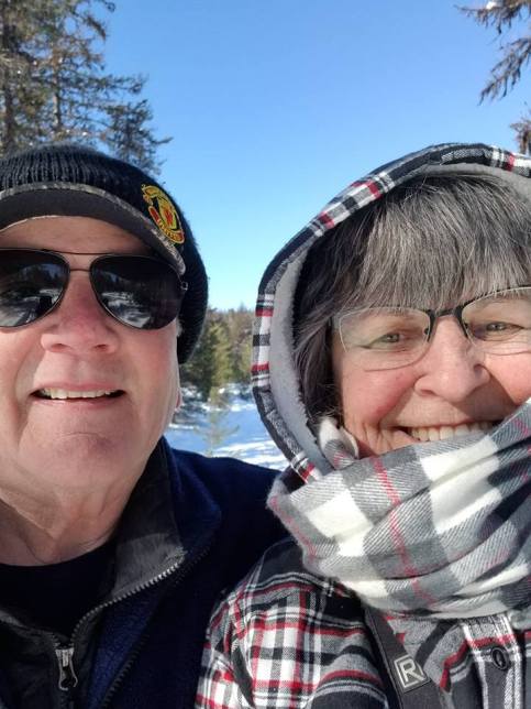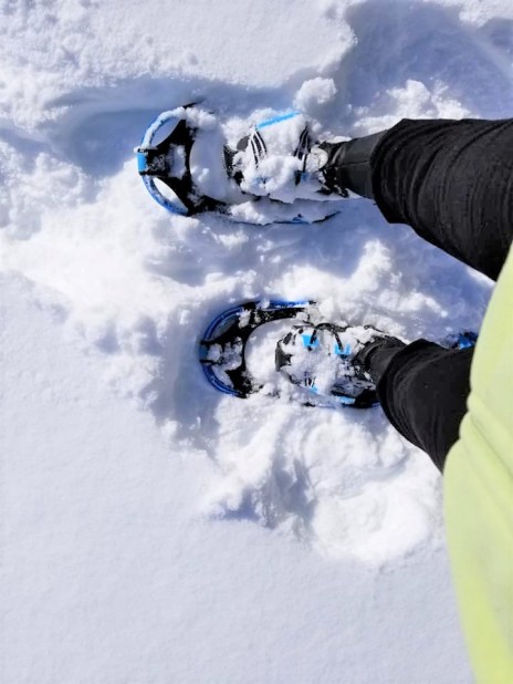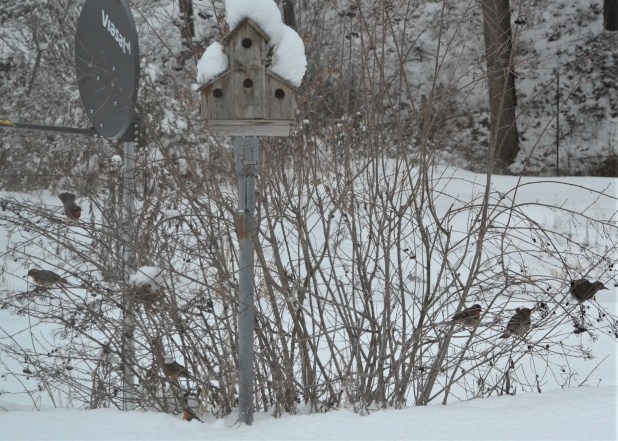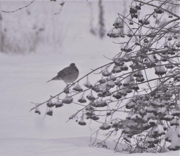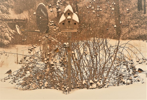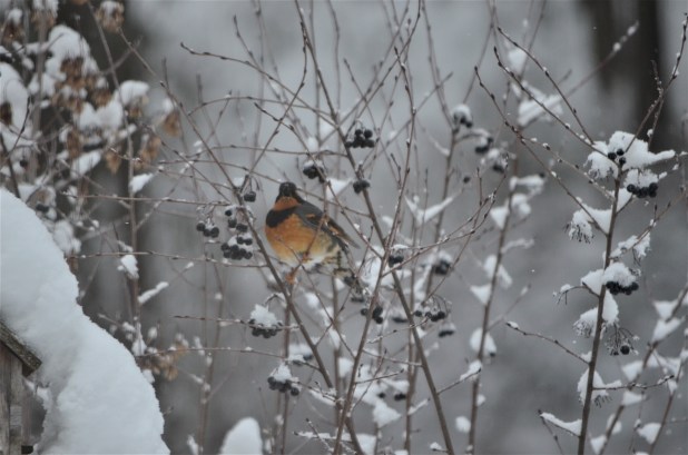 On Wednesday after working outside for several hours with Dear, breaking up ice, I came inside to wash some dishes . I heard Dear doing something on the deck and then he came inside and said, “would you like to join me on the terrace for drinks?”. He had brought a couple lawn chairs and side table out of winter hibernation and set them on the deck. It was so nice and refreshing to be in the fresh air enjoying our view. You can see the snow covered landscape in the reflection off the slider.