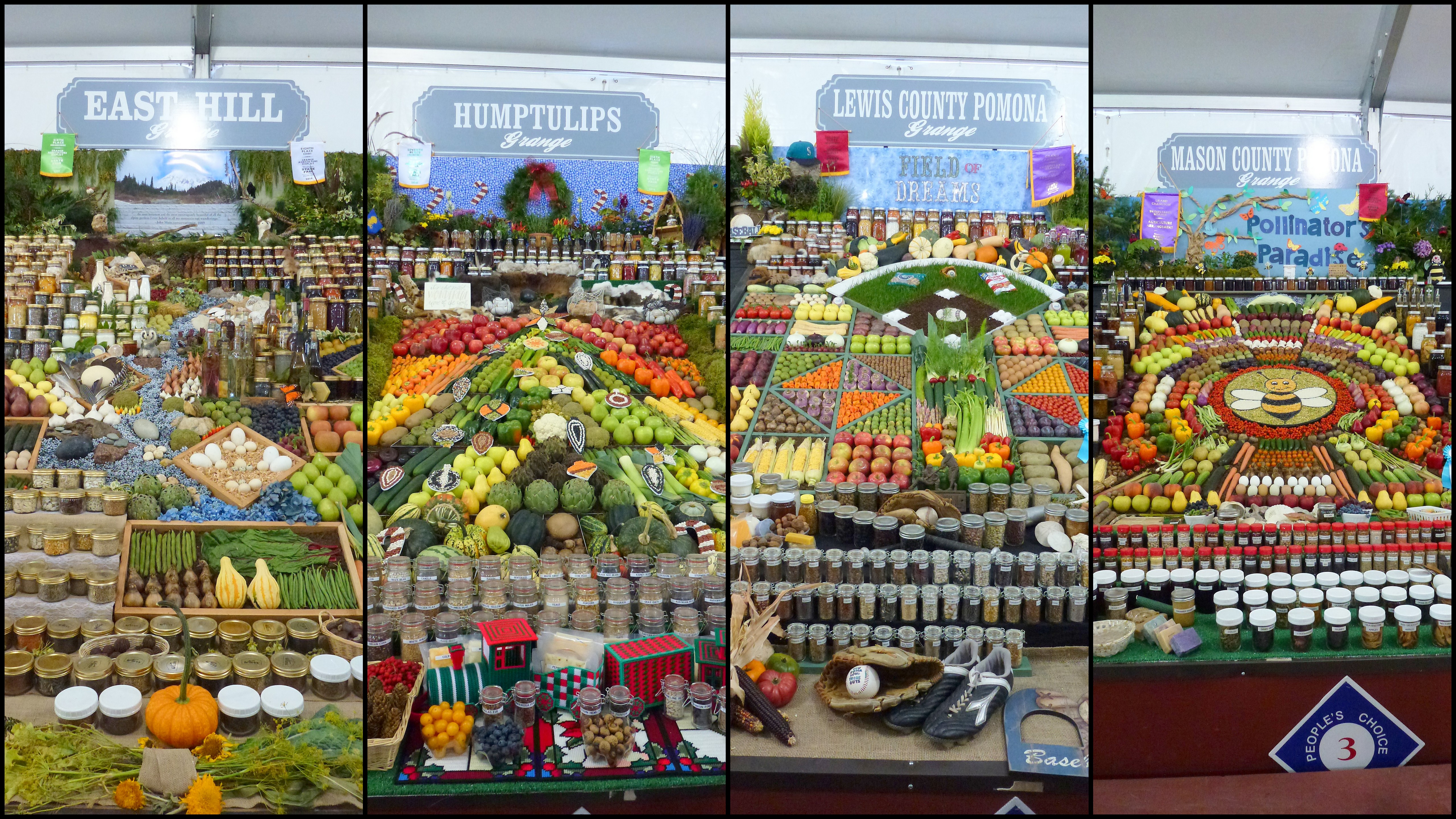 There were several more than these four. Left to right: Easthill Grange with a John Muir Theme, Humptulips Grange with a Christmas theme, Lewis County Pomona Grange with a Field of Dreams theme, and Mason County Pomona Grange with a Pollinator’s Paradise theme. There were many varieties of fruits, vegetables, grains, eggs, canned goods, and honey.