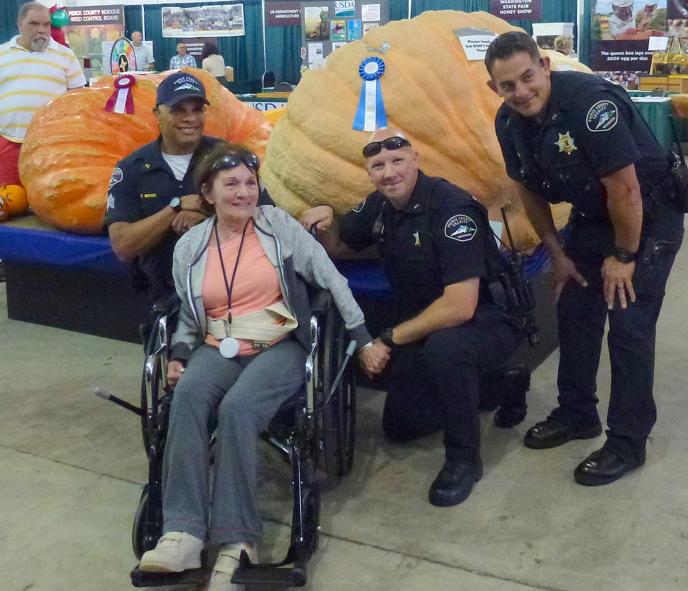 Besides the world’s largest Outlaw Grill we happened upon the grower of the world’s largest pumpkin (1st Prize) taking a photo with the men in blue from Pierce County Sheriffs Department. I think the officer on his knee next to the grower might be her son but I didn’t ask. They resemble each other and they are holding hands and look at the sunglasses.