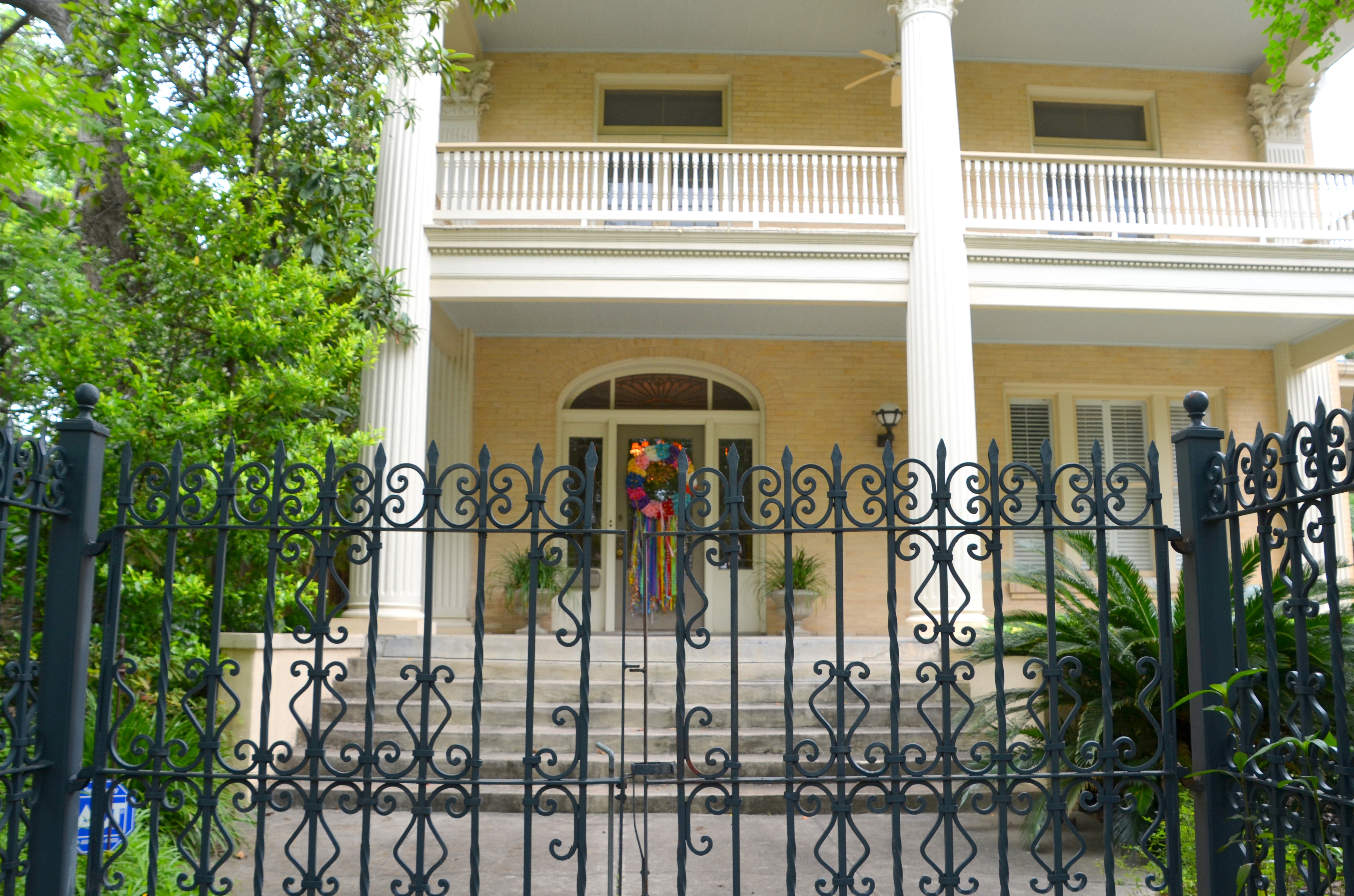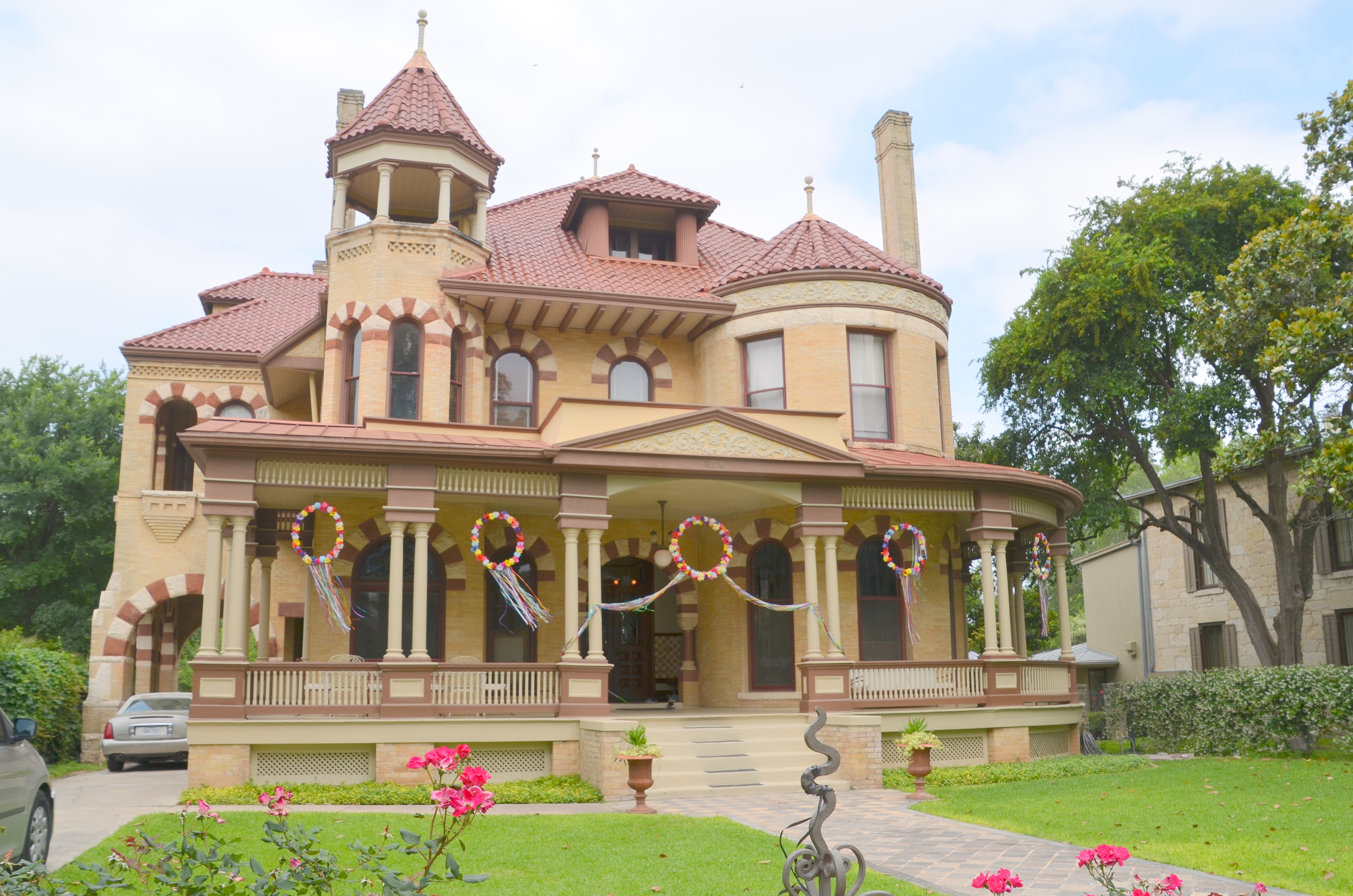 Many of these grand homes had colorful decorations on them that I’m guessing are related to the King William Fair that was held April 29th. I walked down this street on April 27th. I found this little blurb about the Fair parade. “What really sets this event apart is the sparkling beauty of its historic setting near the heart of downtown San Antonio, where the King William neighborhood entices fair-goers to relax and unwind along shady, tree-lined streets adorned with stately Victorian homes, cozy cottages and gracious gardens.”