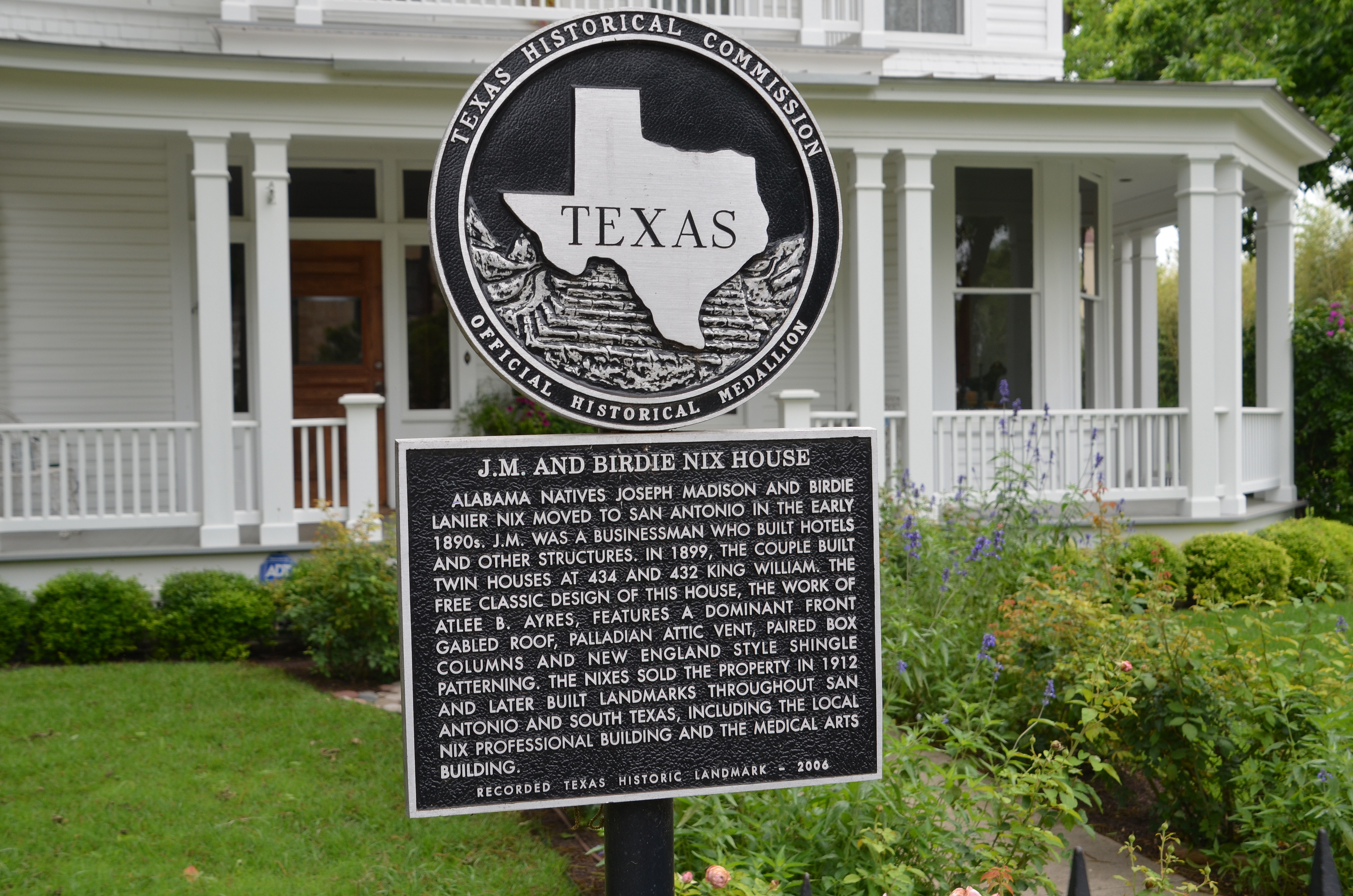 Alabama natives Joseph Madison and Birdie Lanier Nix moved to San Antonio in the early 1890s. J.M. was a businessman who built hotels and other structures. In 1899, the couple built twin houses at 434 and 432 King William. The Free Classic design of this house, the work of Atlee B. Ayres, features a dominant front gabled roof, Palladian attic vent, paired box columns and New England style shingle patterning. The Nixes sold the property in 1912 and later built landmarks throughout San Antonio and South Texas, including the local Nix Professional Building and the Medical Arts Building. Recorded Texas Historic Landmark – 2006