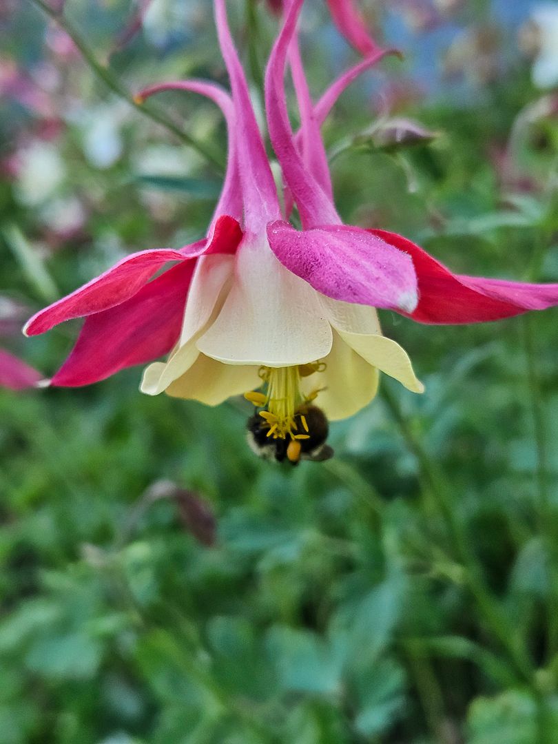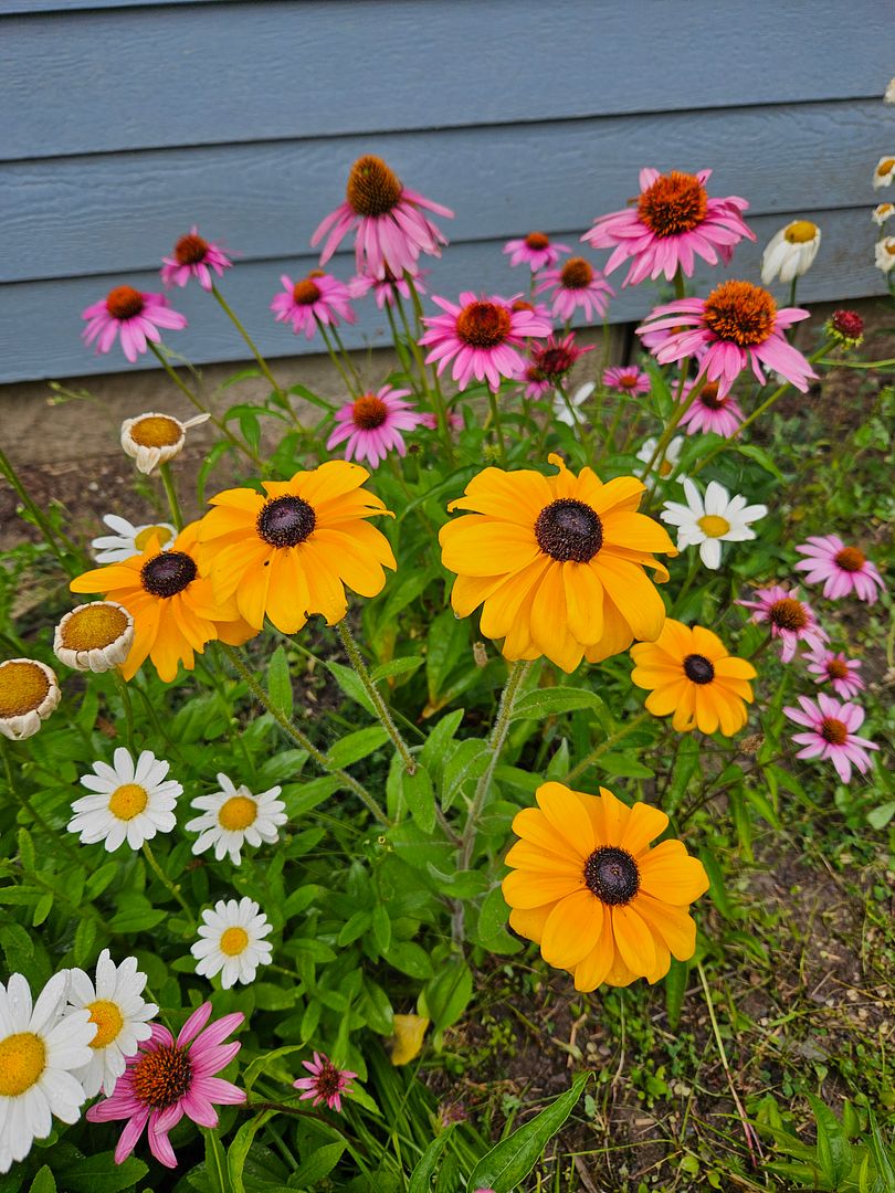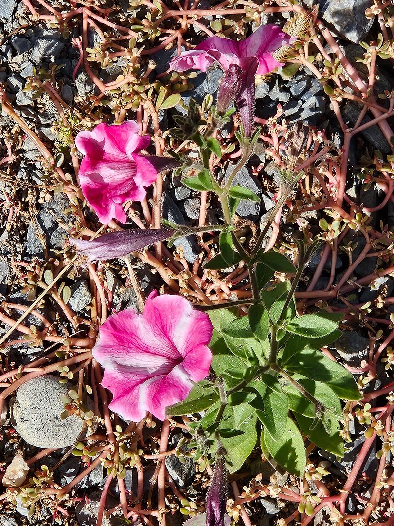 A couple years ago we had a hanging plant with a variety of petunias and all of a sudden this year these popped up on the ground under the spot where the plant was hanging. Fun.
