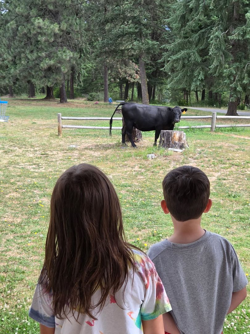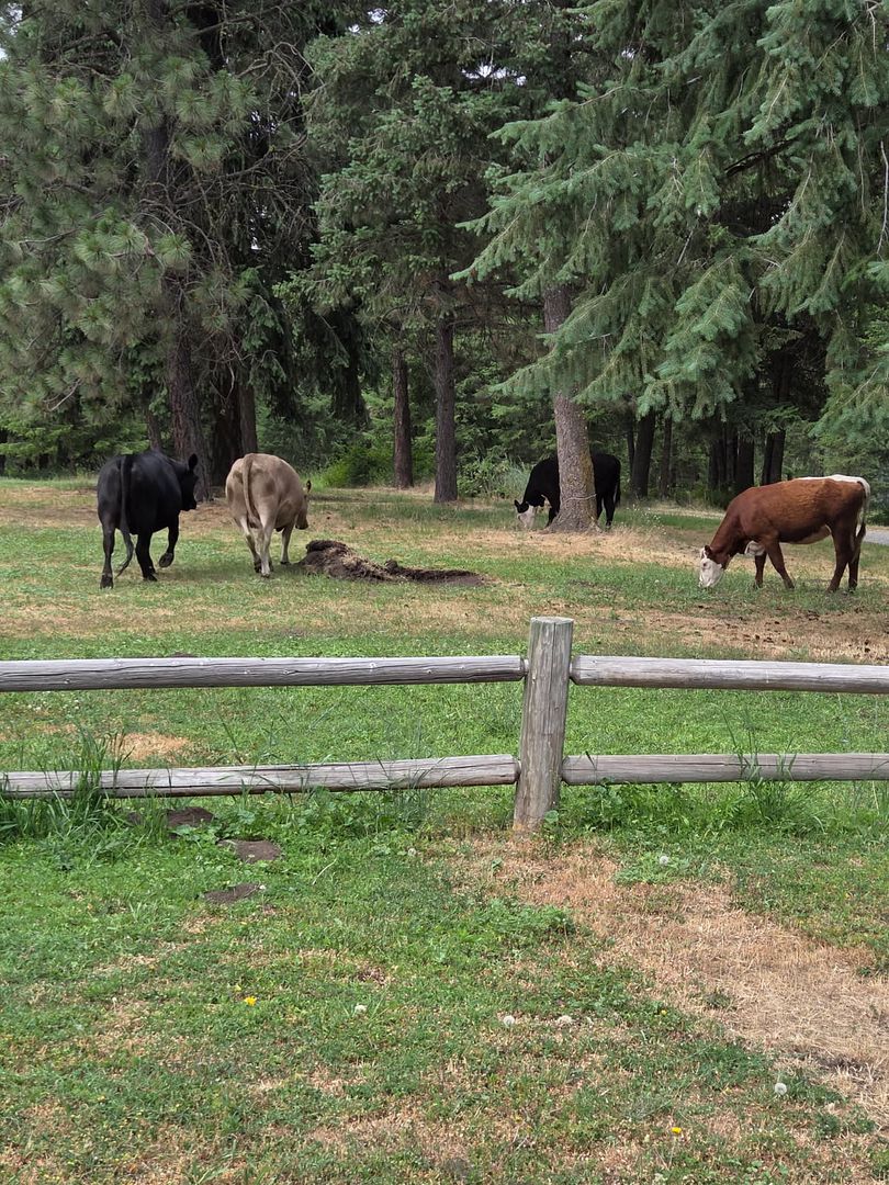 Our kids had uninvited visitors on their mountain. The farmer/rancher was called to lead this girl back home…but she must have told her friends that the grass was greener here because later in the day this crew arrived. There are fencing repairs needed by the owner of these cows.