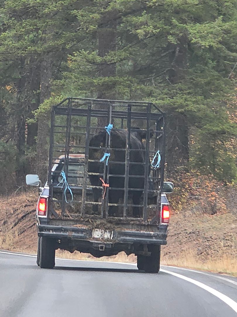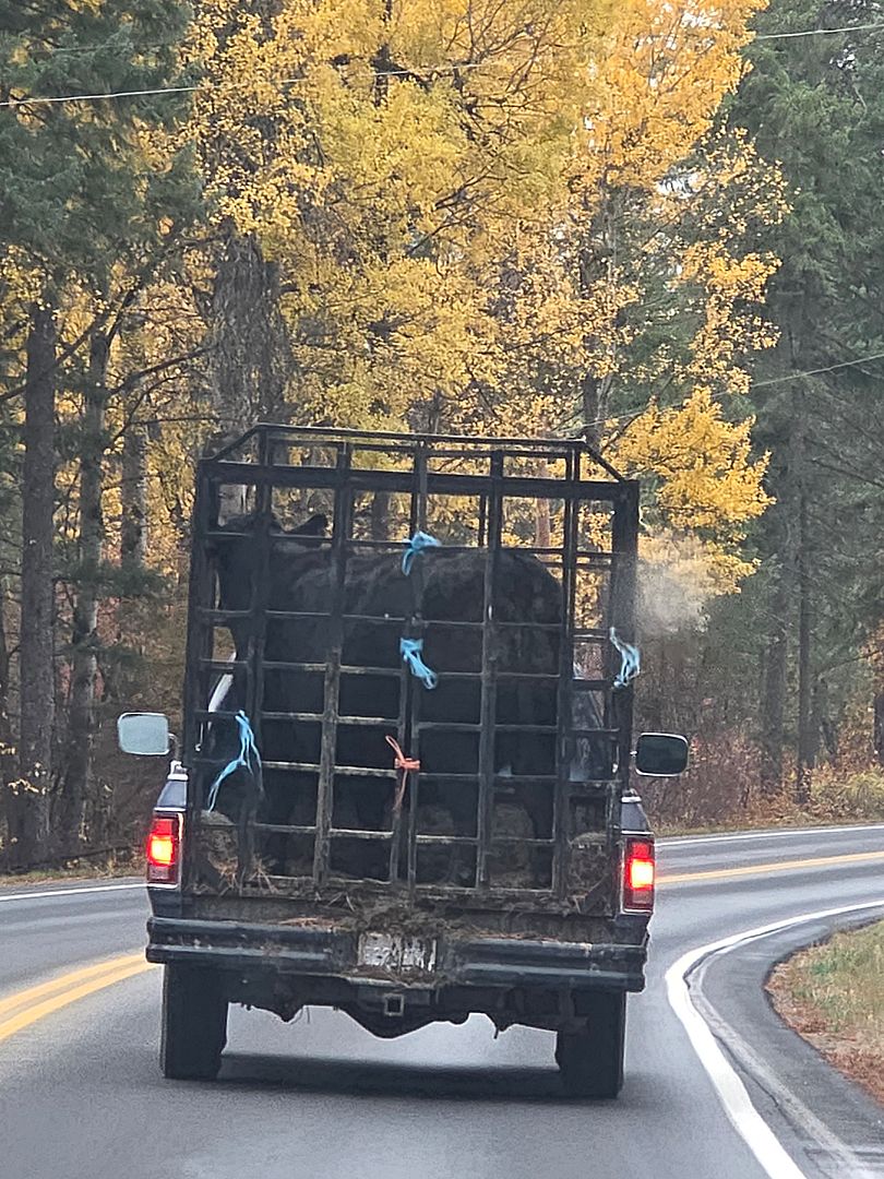 We dropped our friends off at the airport and headed into Spokane to do a little shopping at Costco. After Costco we headed north on highway 2 for a late lunch in Elk. After lunch while traveling backroads back to Highway 395 we chuckled at this sight in front of us.