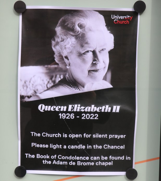 In many store windows in Oxford and in chapels of the Oxford colleges and other churches there are tributes like these to the beloved Queen Elizabeth II.