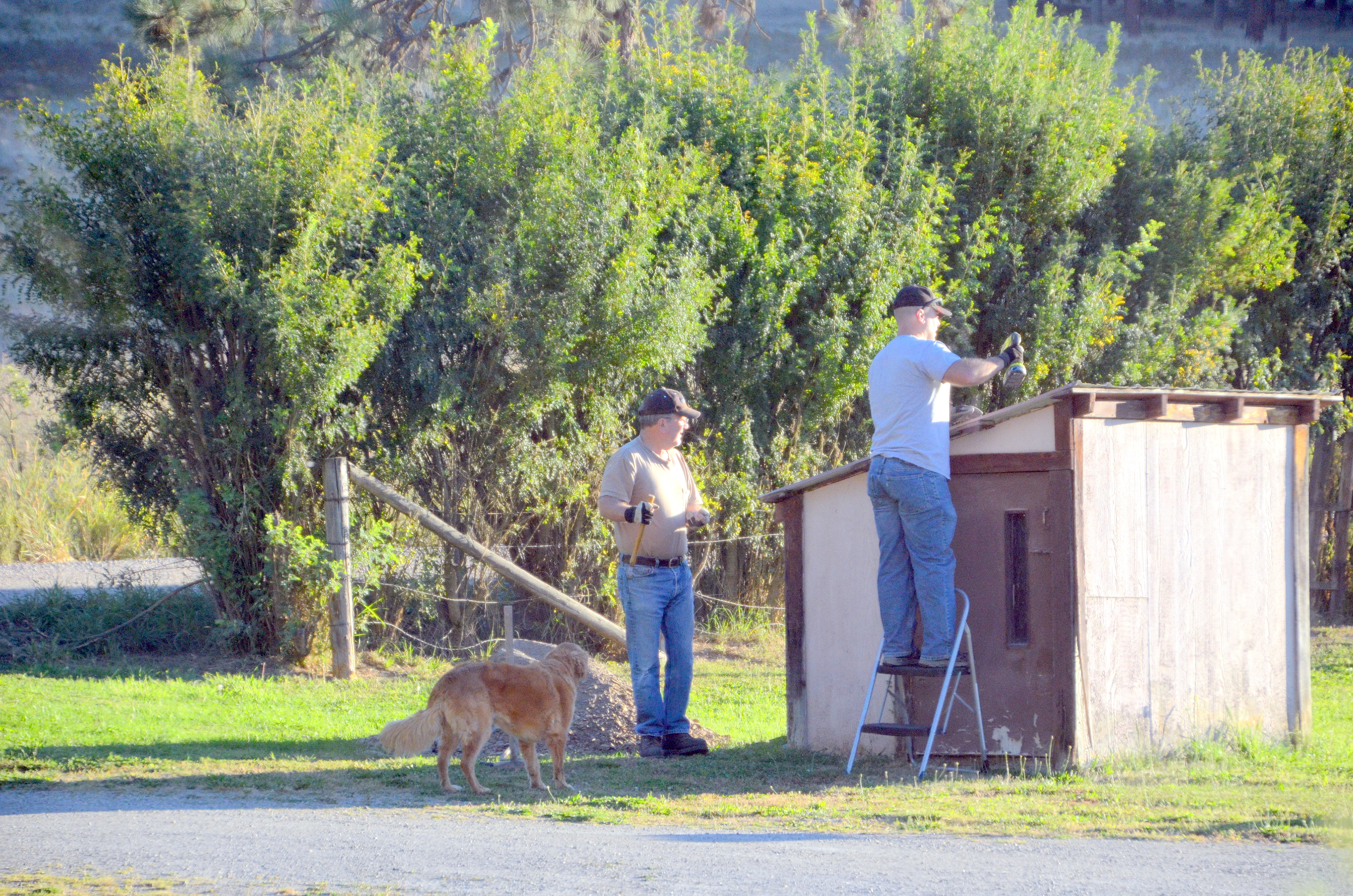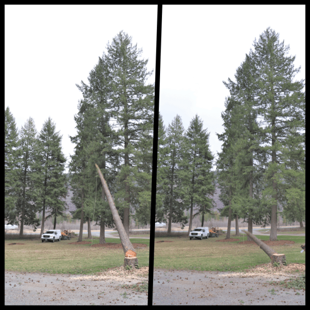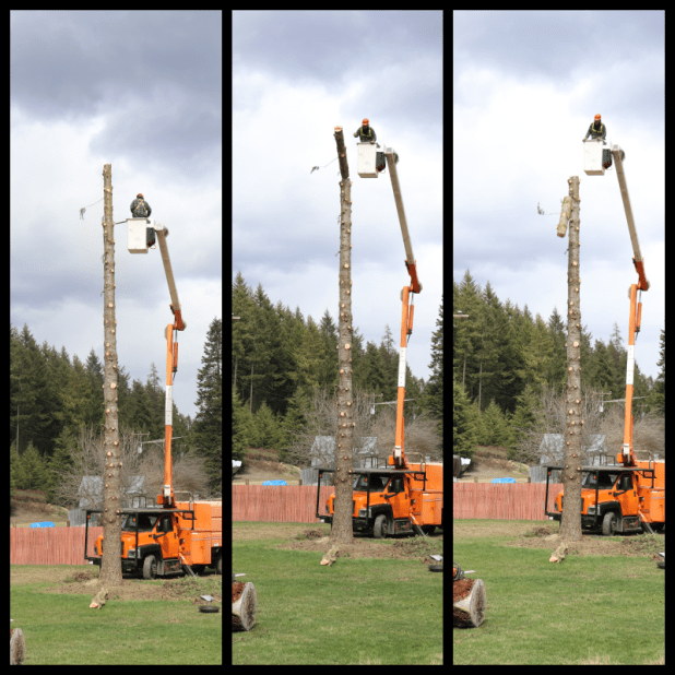 On the letter O today and I’m using an old saying to show our tree service chopping or felling two trees we were concerned about on our property. Two Douglas Fir trees came down in a jiffy with the right equipment. The grinding of the stumps took a bit longer.
