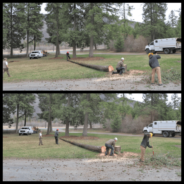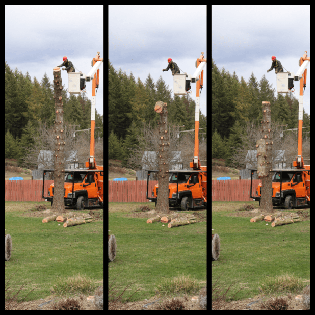 Our experienced tree service guy said it was a really good choice to take this tree out as the base of the tree was rotting on the side of the trunk towards our house. We were thankful for that decision. We were only going to have the one in the back taken down until the tree people offered to do this one for half the price since they were on our property with all of their equipment already. They got in a full day of work with good pay and we got two down for the price of one and a half! We are counting our blessings!