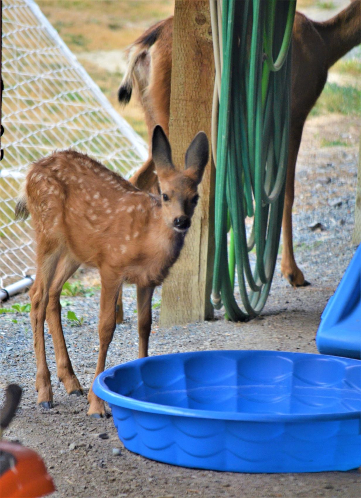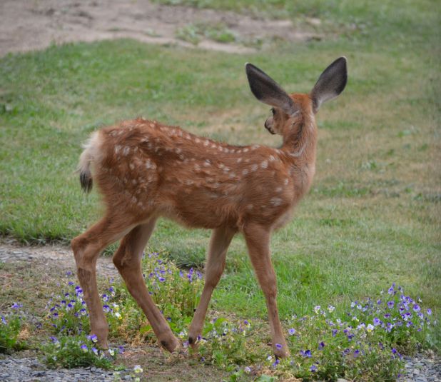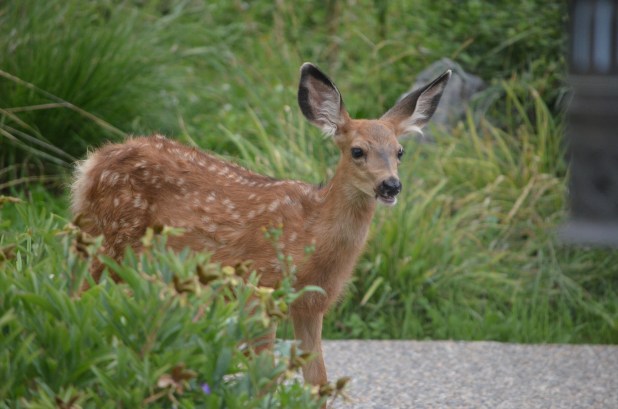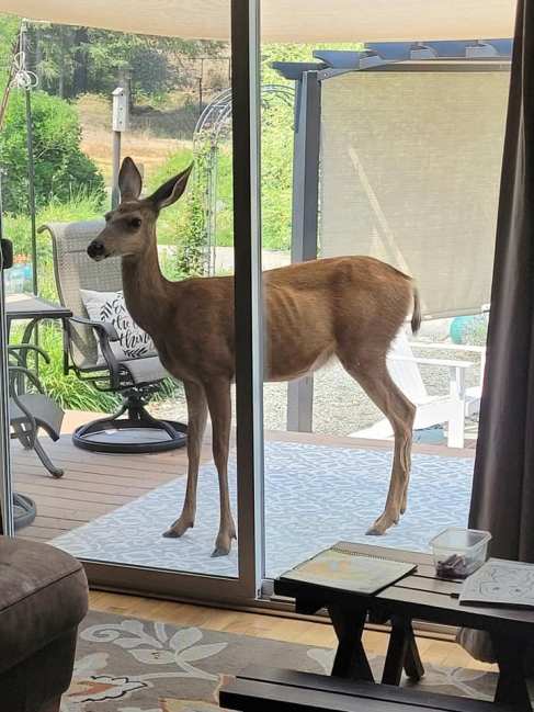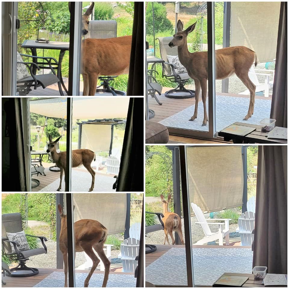 This mama deer stepped up onto our deck and was resting on our patio rug. This is the first time something like that has happened. We didn’t want to frighten her and have her kick at the glass slider.