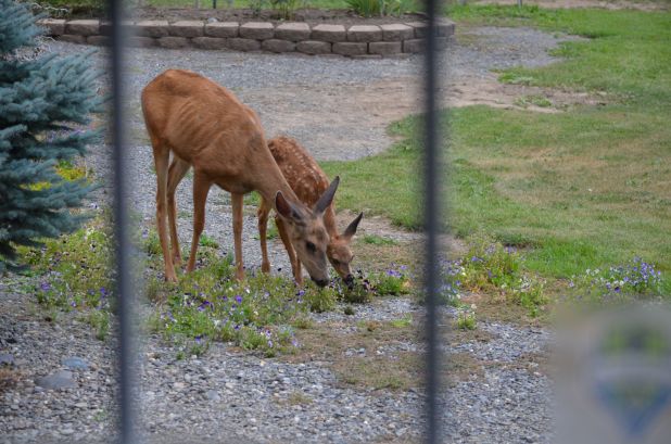We’ve had bucks and does visit regularly during our heat and lack of rain. The bucks rest in the shade under the shed roof on the back of the garage. The doe rests under the variegated willow.