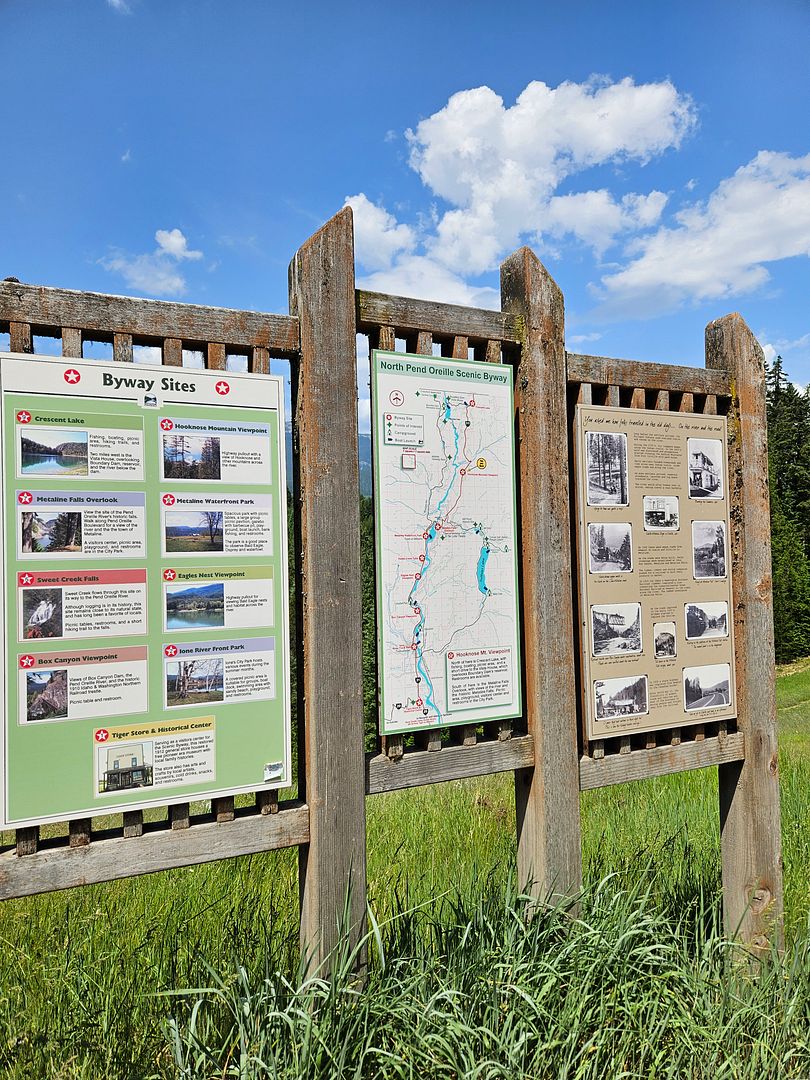 We stopped at this roadside sign after we enjoyed the Falls. It’s a nice map with places to enjoy along the North Pend Oreille Scenic Byway. We met two gals from Florida and were just finishing their drive on the Selkirk International Loop that runs through parts of Idaho, Canada and Washington. We enjoyed a nice conversation. They were hungry and I could wholeheartedly recommend the Farmhouse Cafe in Metaline Falls. They were the only two other travelers we saw at any of our stops!