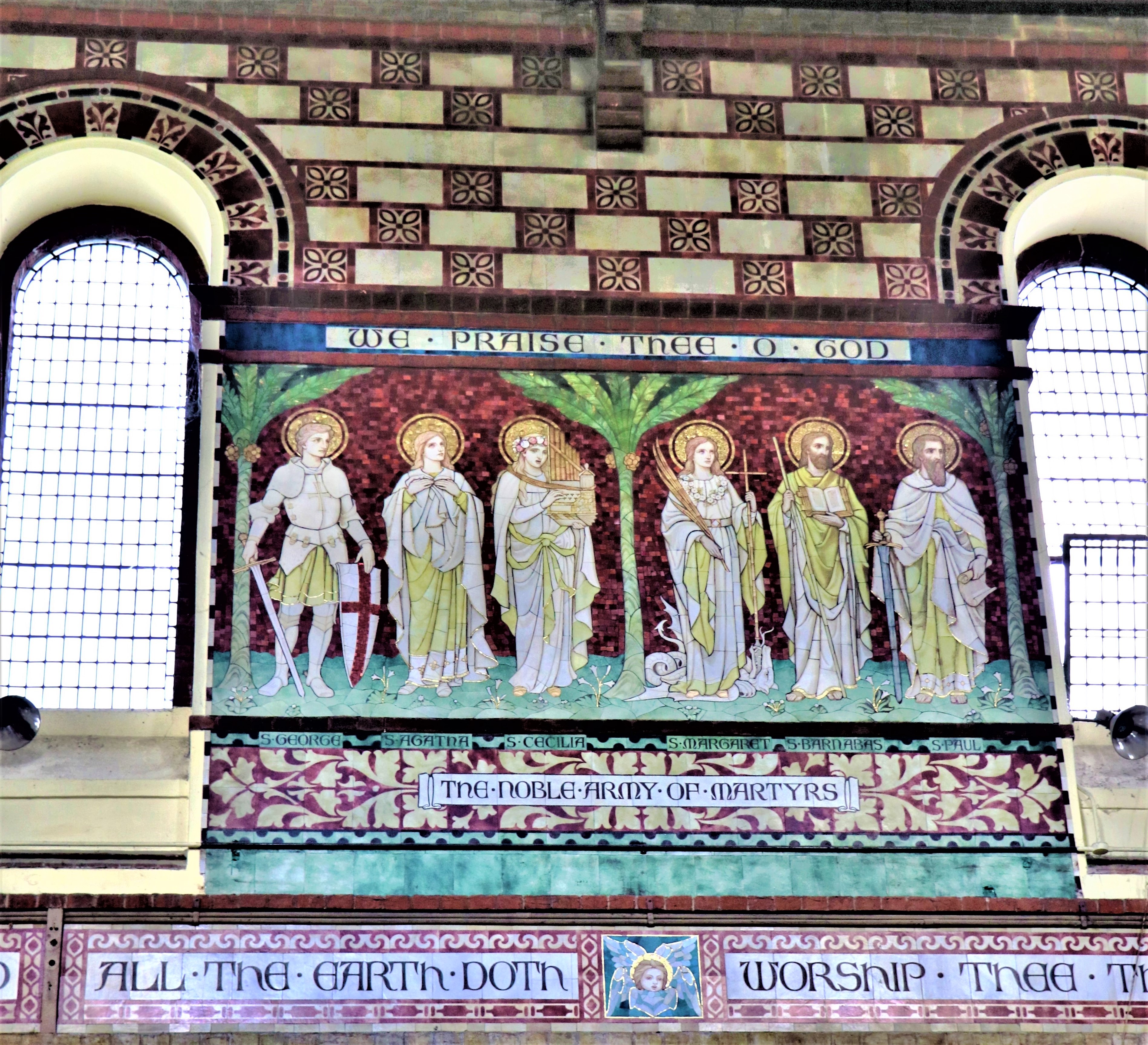 The murals on the north wall of the nave represent Te Deum laudamus, (Latin: “God, We Praise You” ) and are made of cut glass using the “opus sectile” technique.