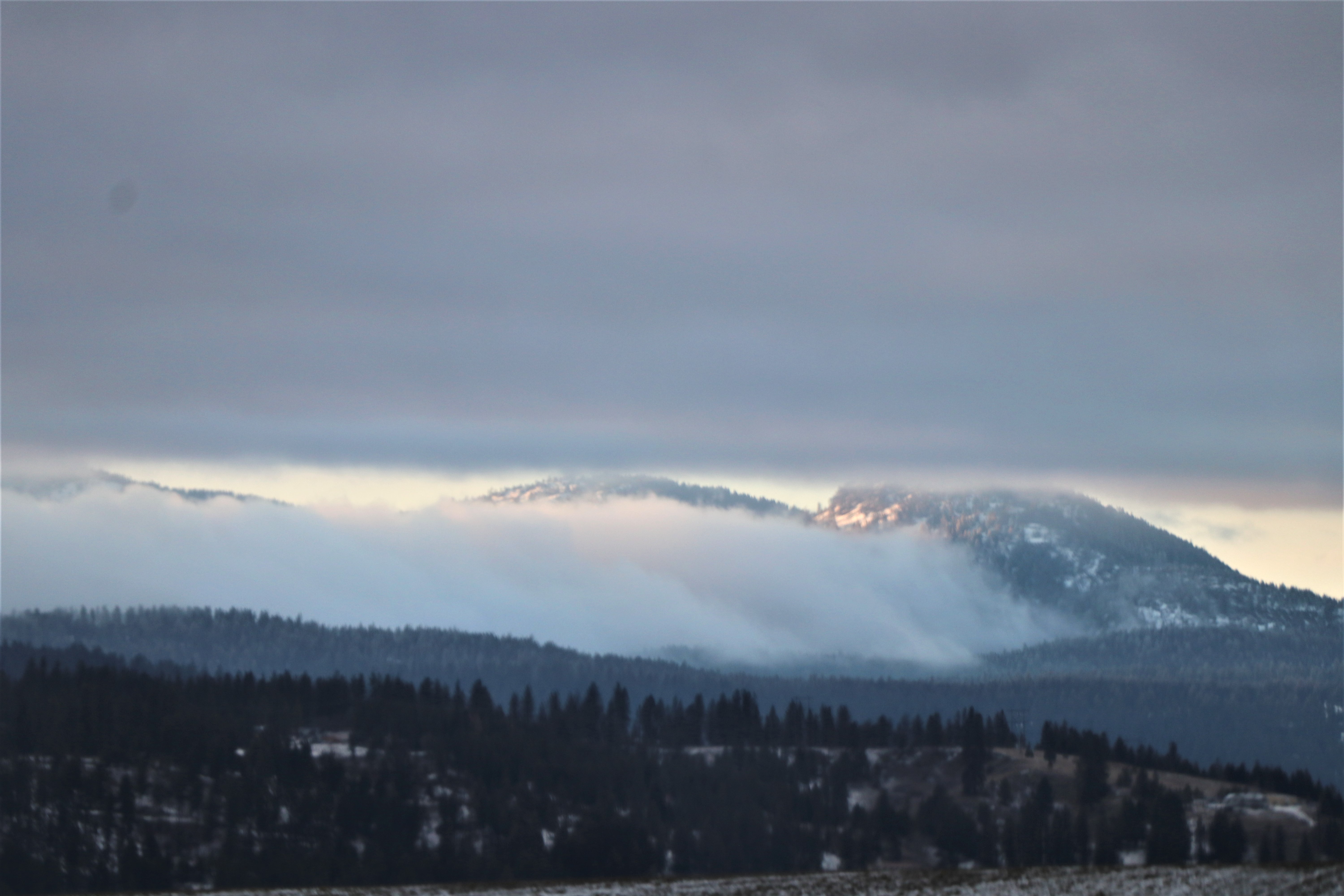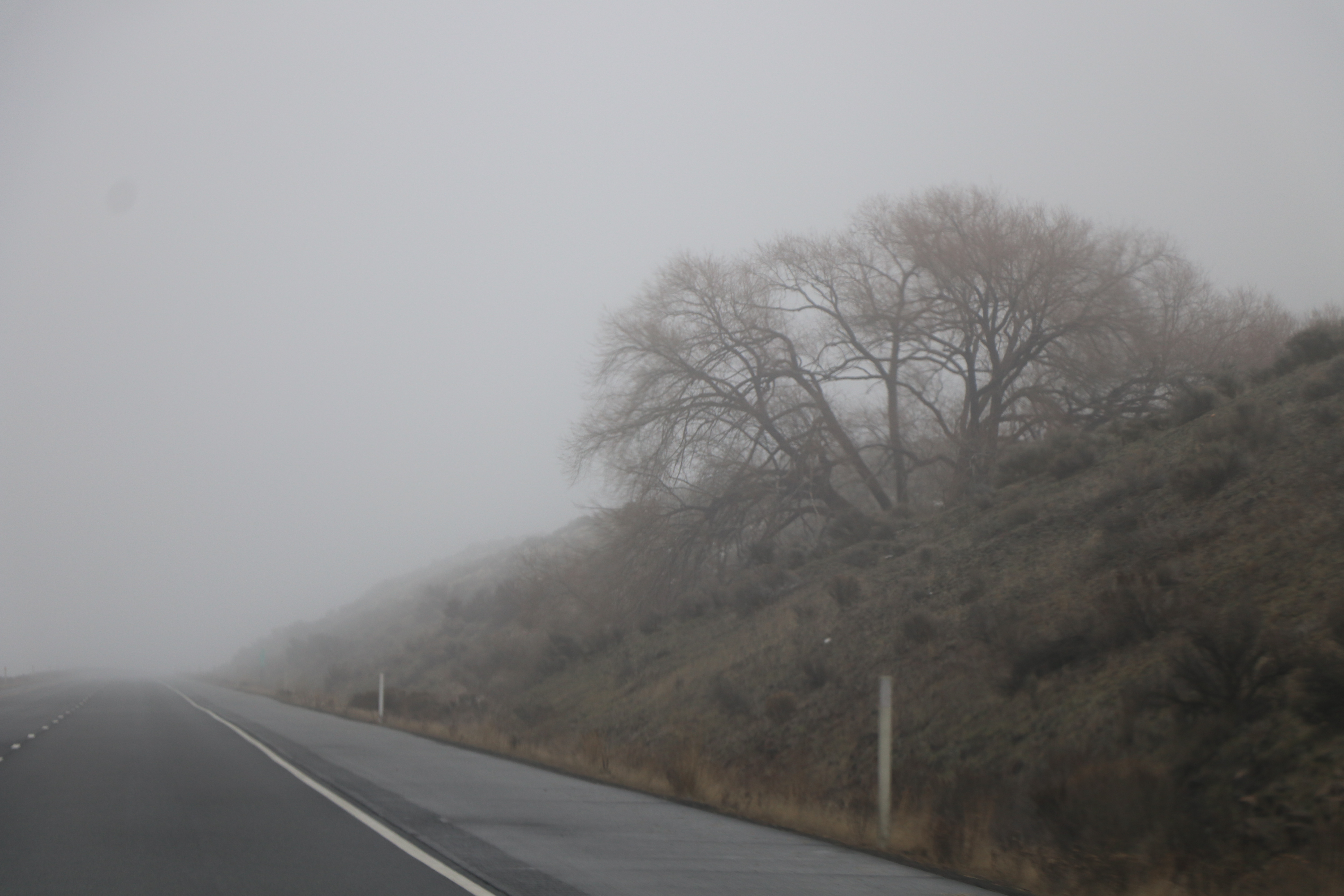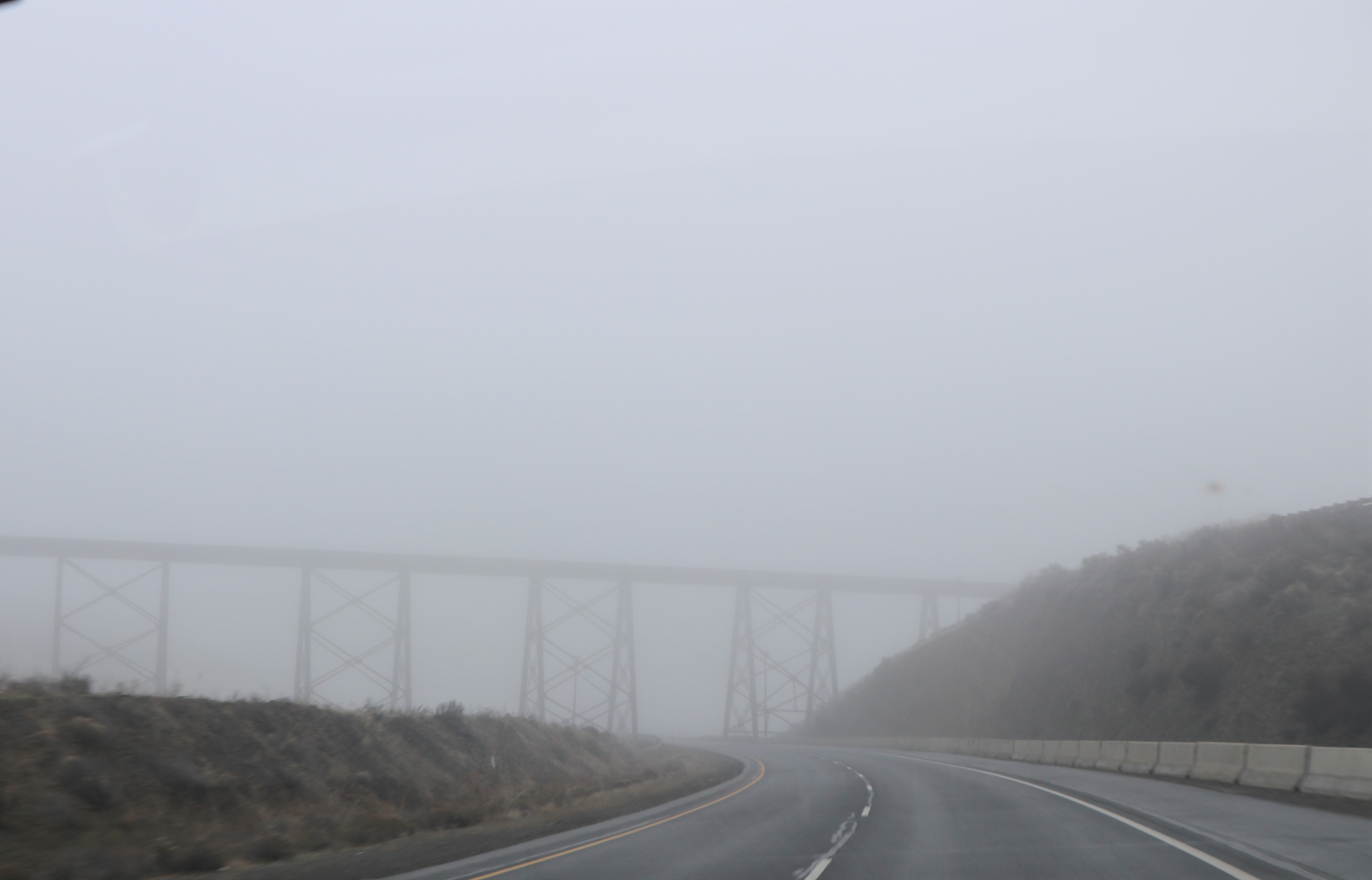 We saw a lot of birds of prey from Cle Elum on through Ellensburg. Hard to get good photos speeding along the interstate at 70 miles plus. This was one eagle I was able to capture. After Ellensburg as we headed up and over Ryegrass we encountered some heavy fog that put a huge strain on our eyes.