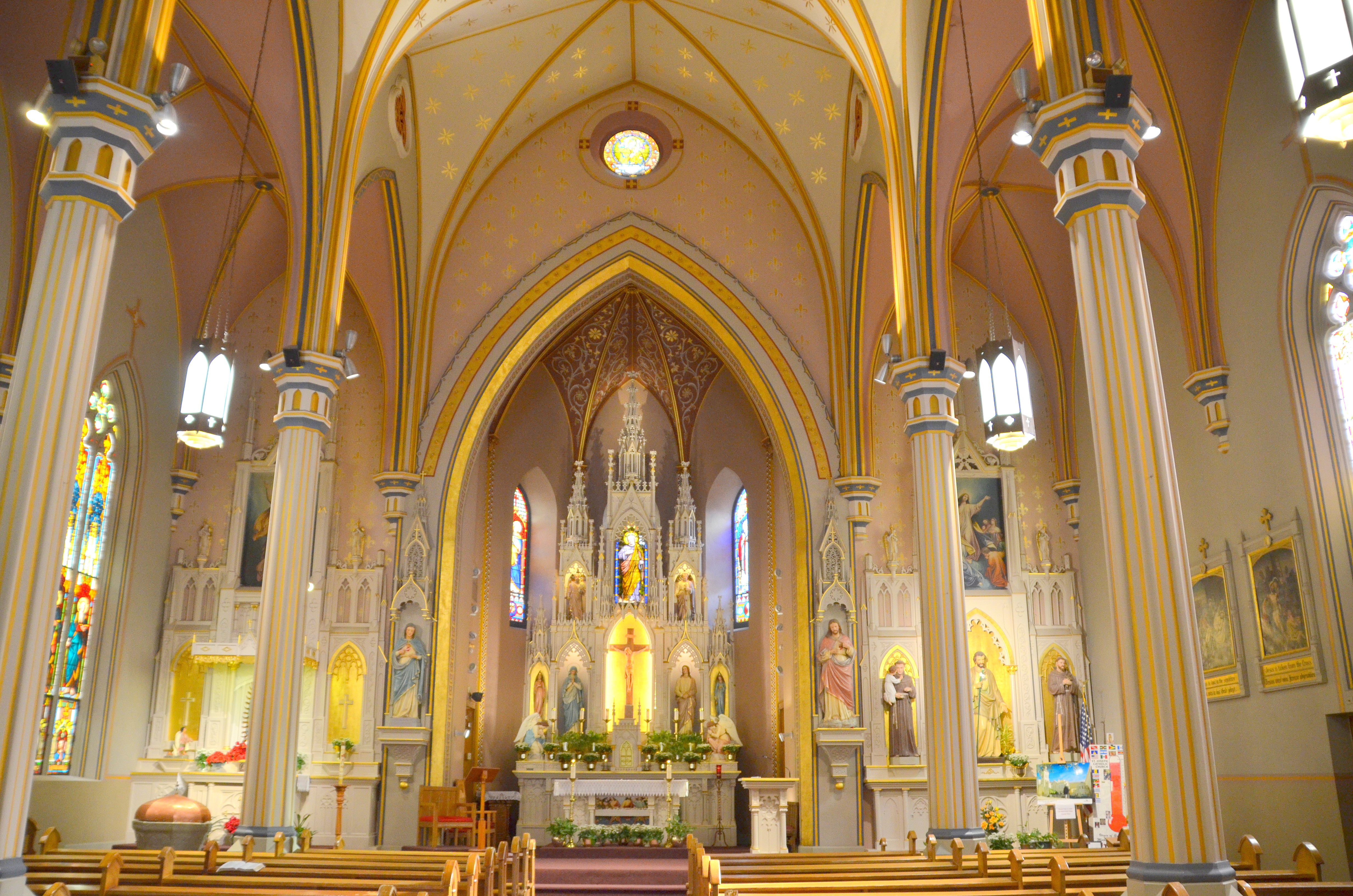 Over the course of years the German Community constantly improved their Parish of St. Joseph and its buildings. In 1891, four bells with matched tones were purchased and consecrated. They were given the names of Joseph, Mary, Henry and Joseph, by their donors as was the German custom. The Gothic style building was without a steeple until 1898 when the now existing spire was erected to crown and complete the structure as it is today.