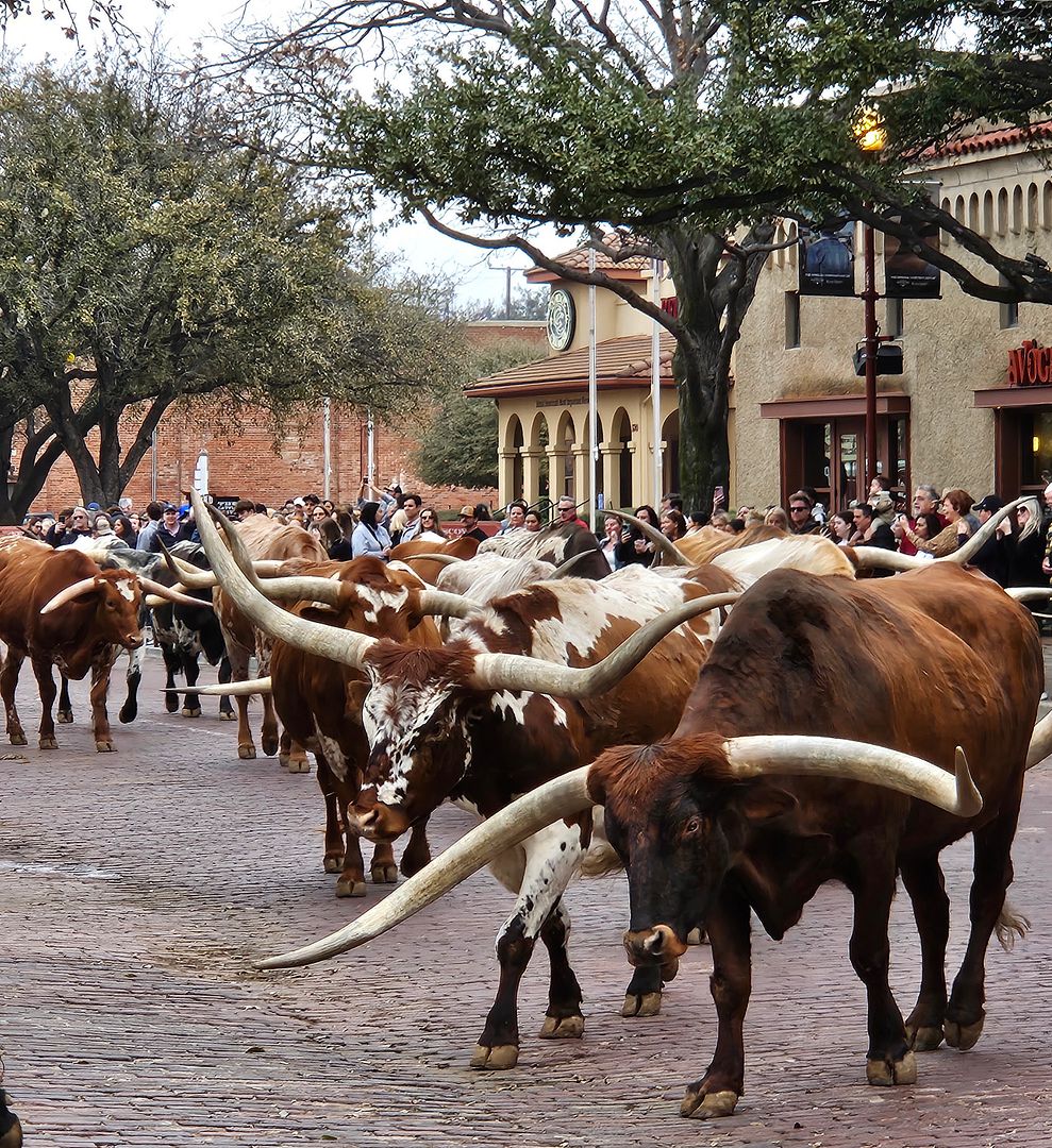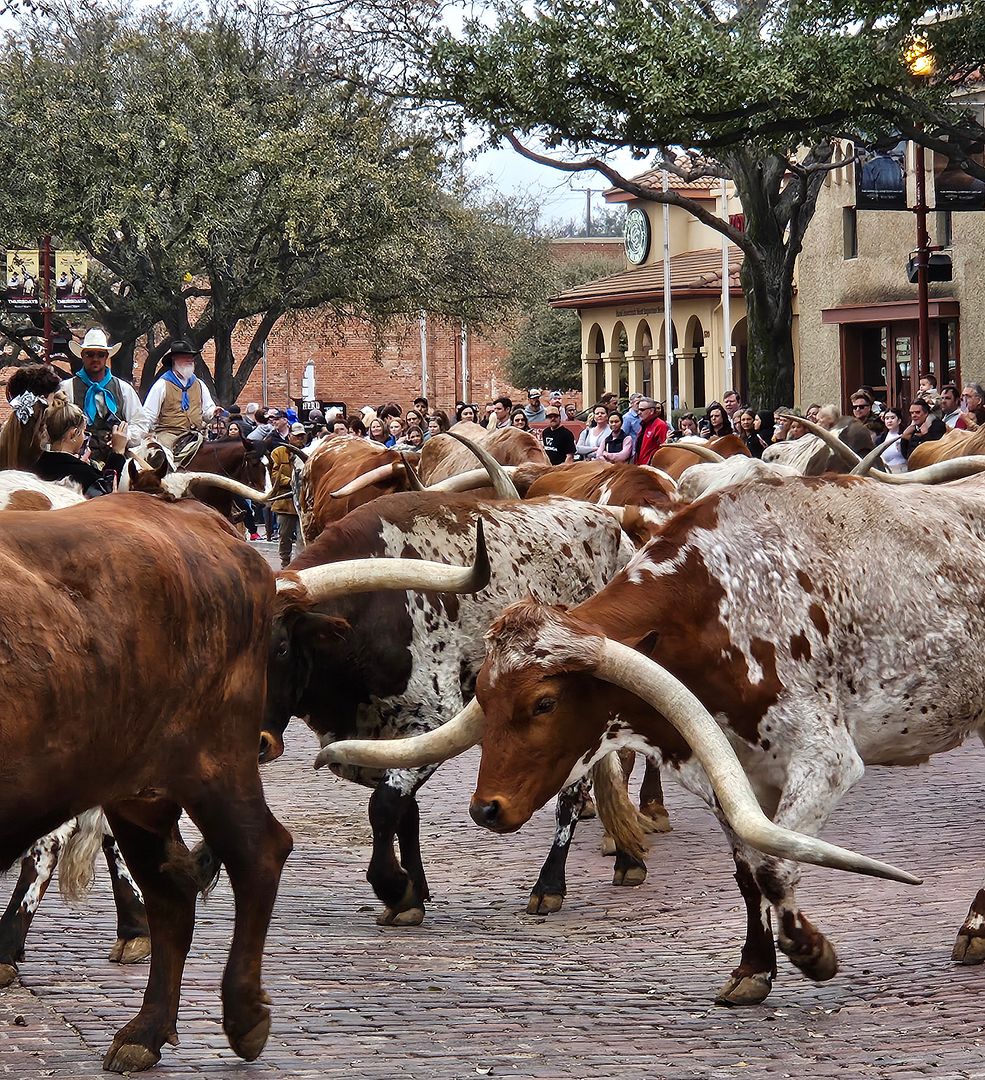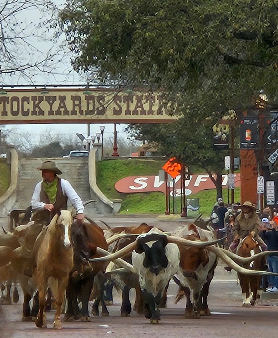 The plan for our Monday in Texas was to visit the Fort Worth Stockyards. Steve dropped us off close to Exchange Avenue where the cattle drive would take place at 11:30 A.M. While he looked for a parking spot we moseyed over to find our spot in the crowds waiting to see the cattle drive. This happens twice a day.