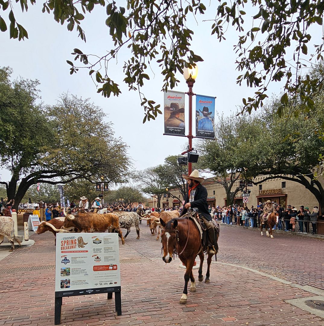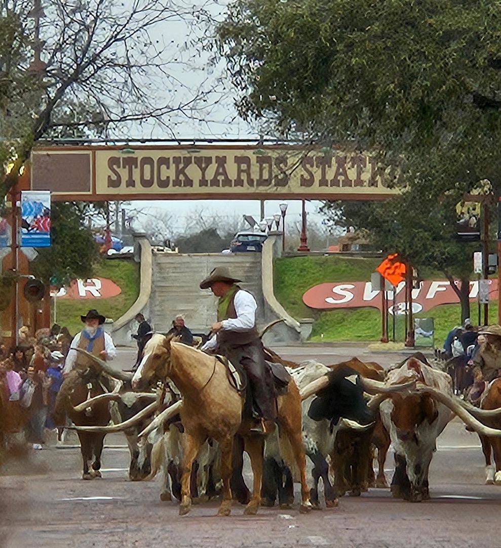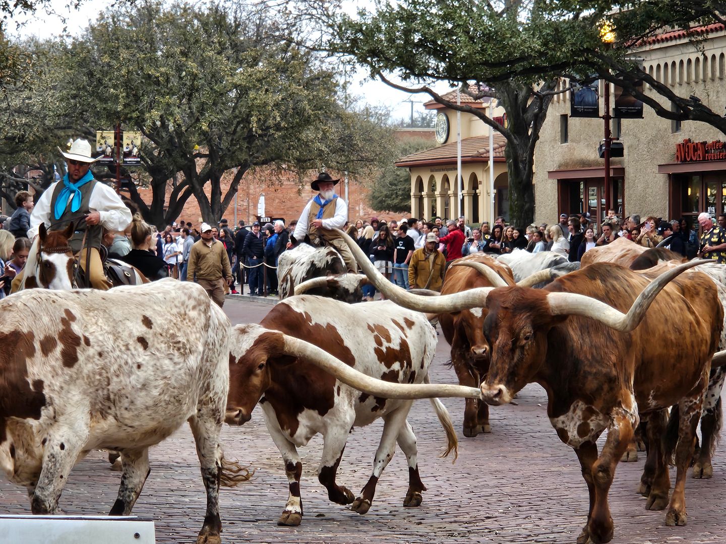 The plan for our Monday in Texas was to visit the Fort Worth Stockyards. Steve dropped us off close to Exchange Avenue where the cattle drive would take place at 11:30 A.M. While he looked for a parking spot we moseyed over to find our spot in the crowds waiting to see the cattle drive. This happens twice a day.