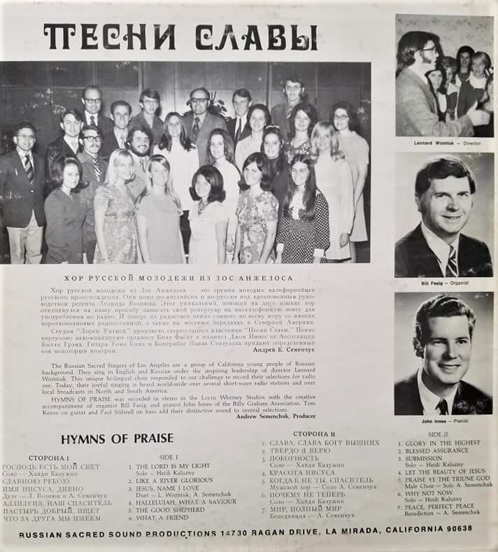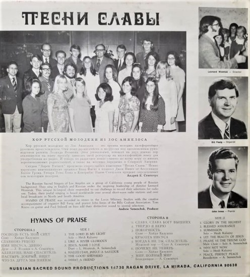 The Russian Sacred Singers of Los Angeles are a group of California young people of Russian background. They sing in English and Russian under the inspiring leadership of director Leonard Wozniuk. The unique bi-lingual choir responded to our challenge to record their selections for radio use. Today, their joyful singing is heard world-wide over several short-wave radio stations and over local broadcasts in North and South America.