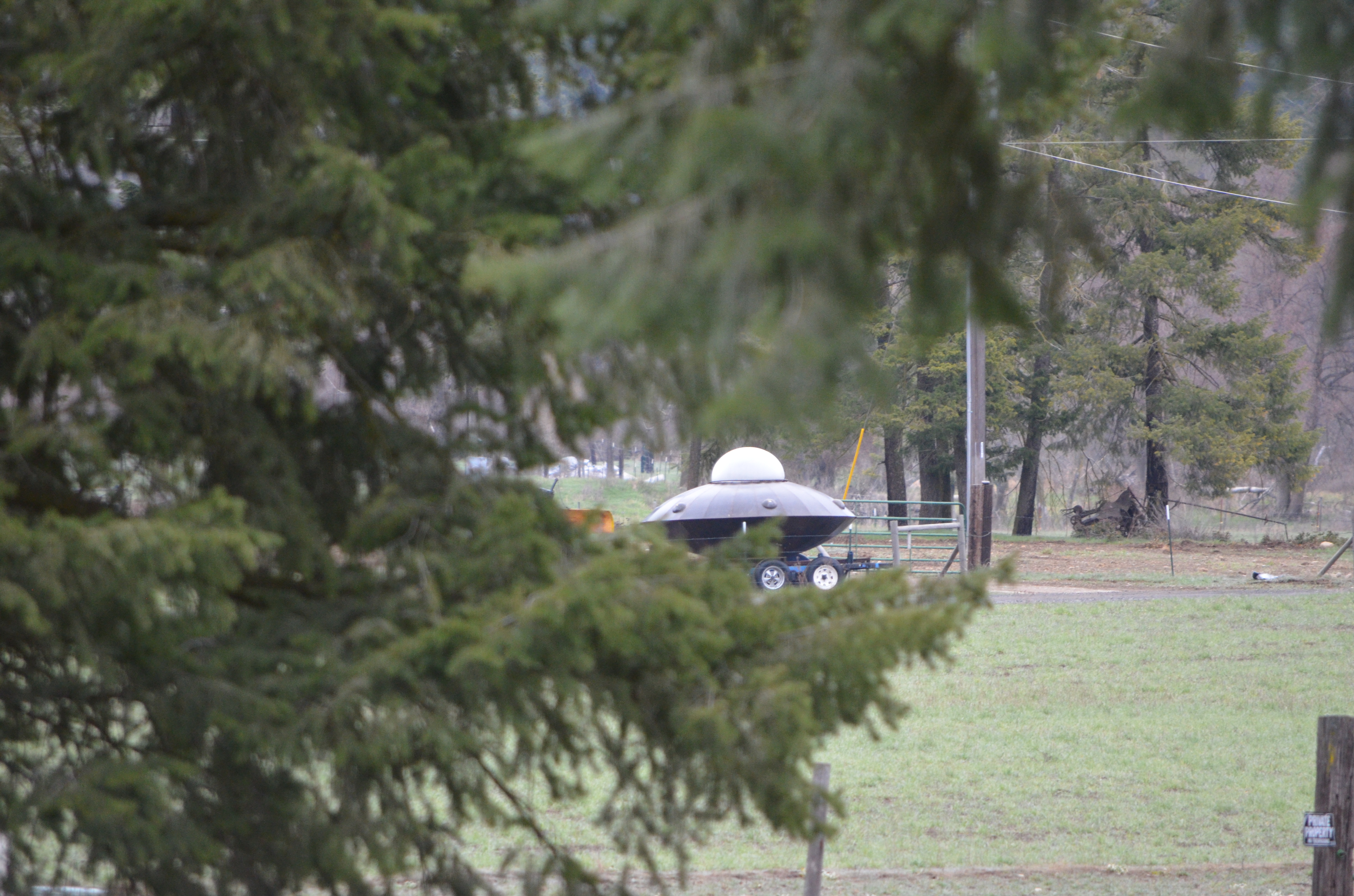 The saucer is between the two middle trees far off in the distance.