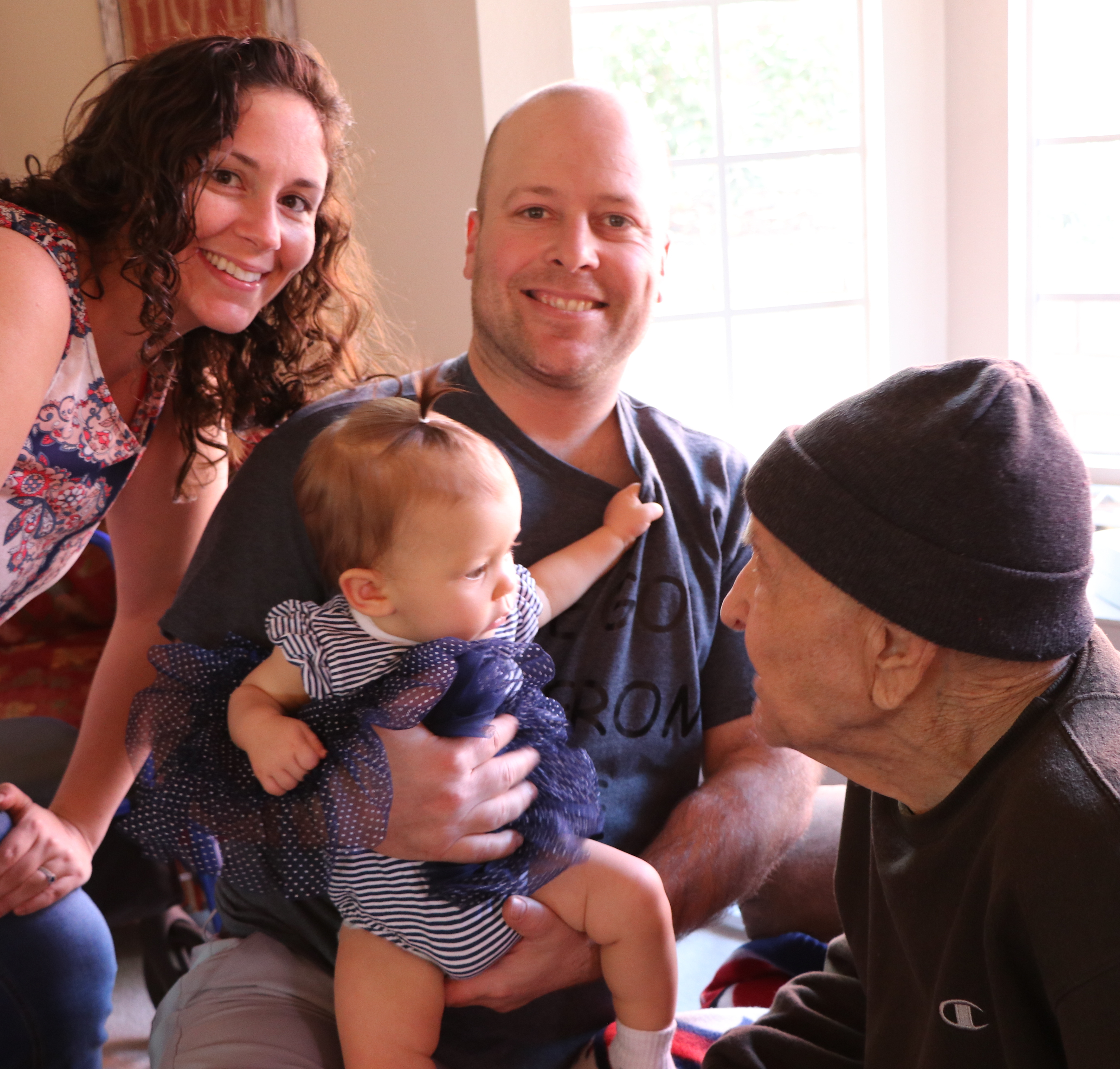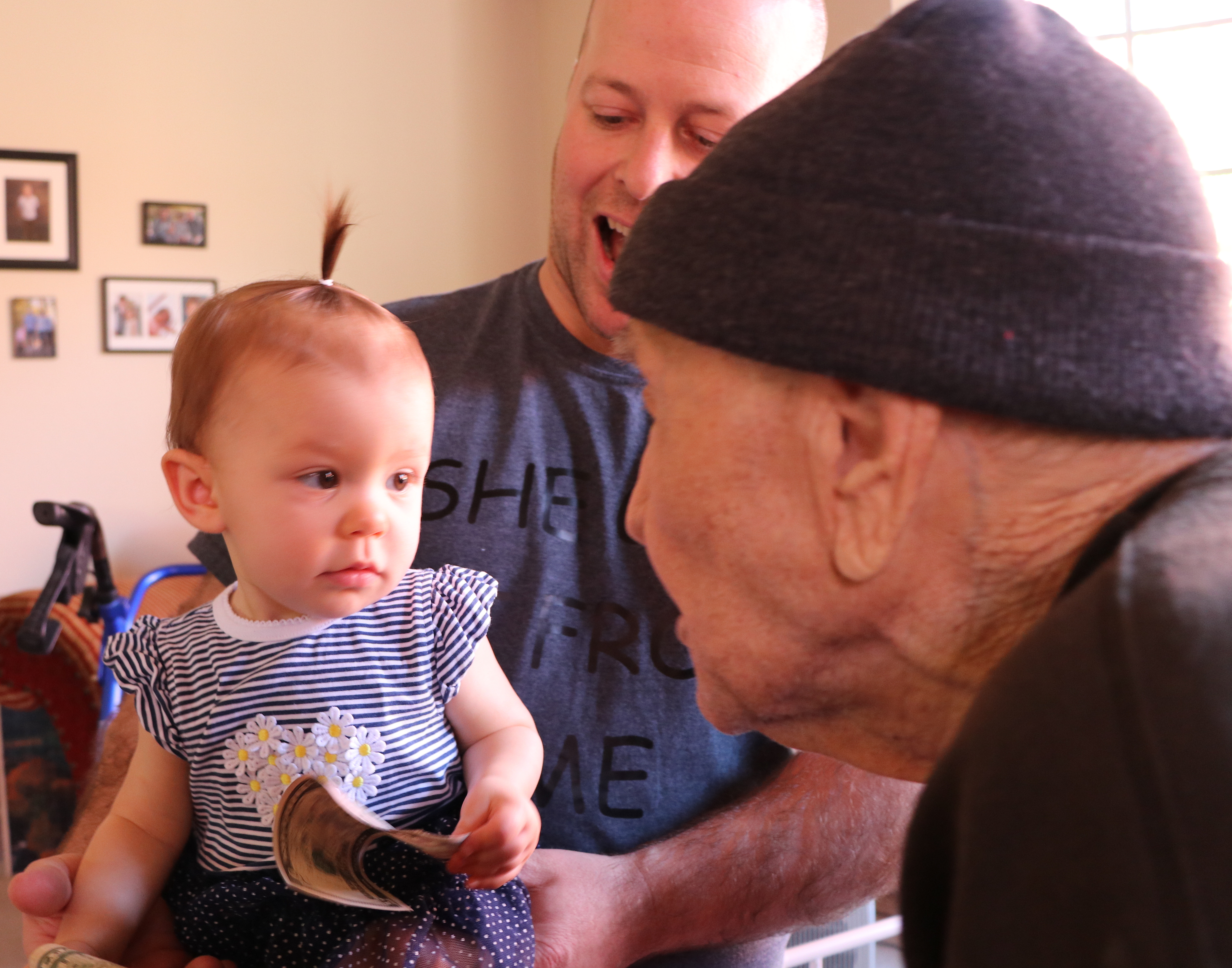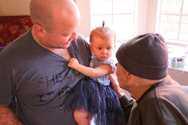 On the Monday after Super Bowl Sunday we traveled inland from Huntington Beach to see my pop. This would be the first time Pop would meet Addy, his youngest great granddaughter. Addy was very concerned about our pop who is not looking well. She had quite a grip on her daddy’s t-shirt.