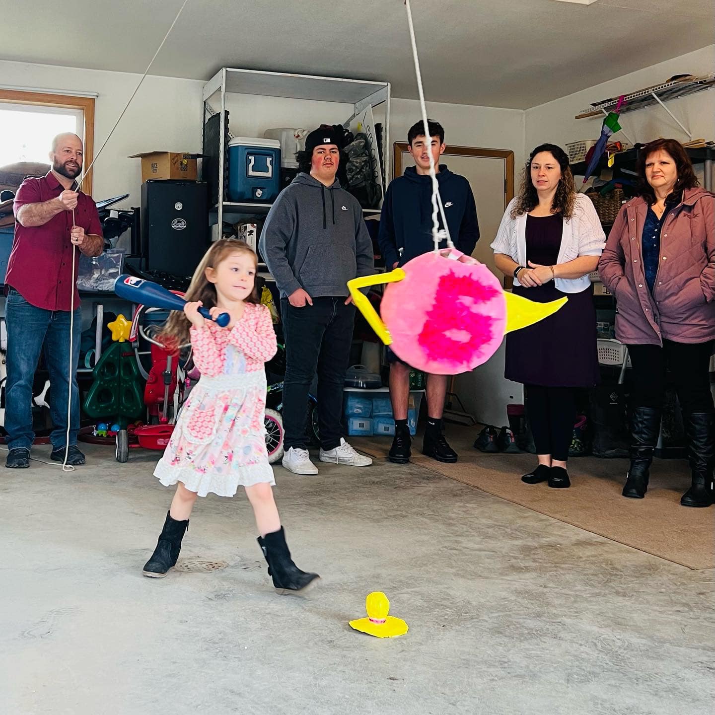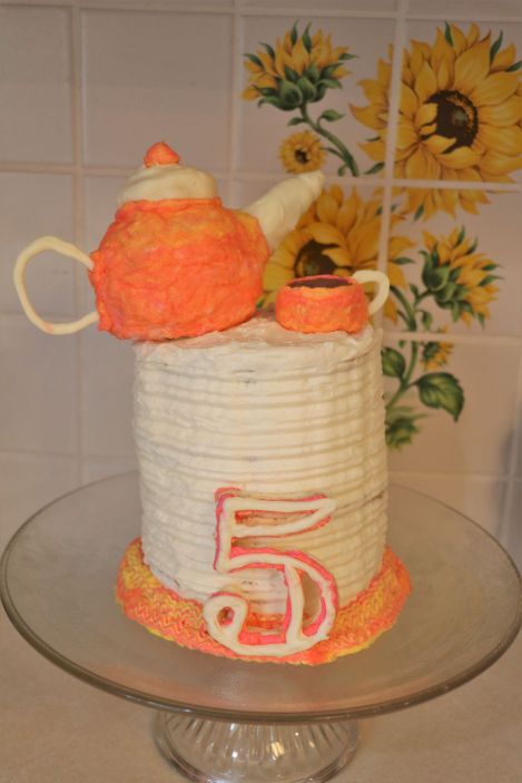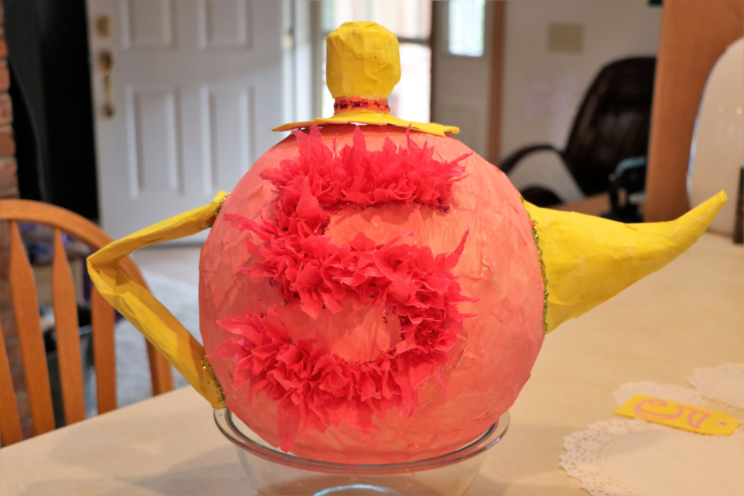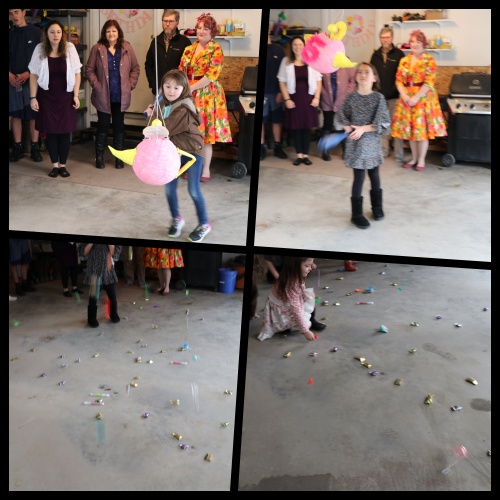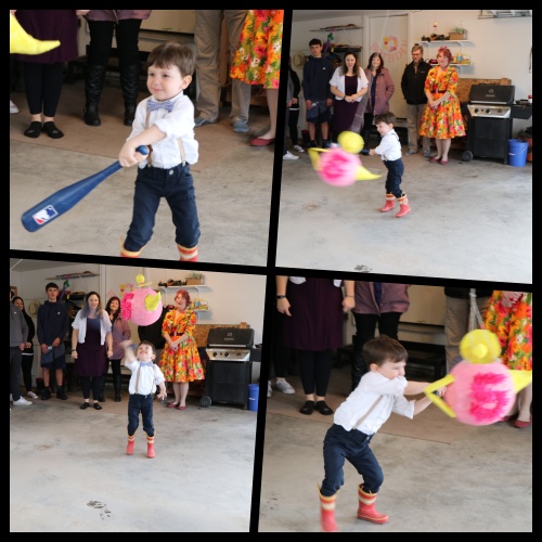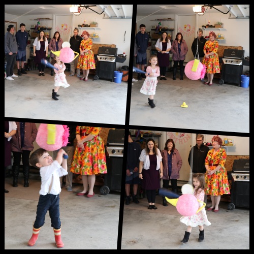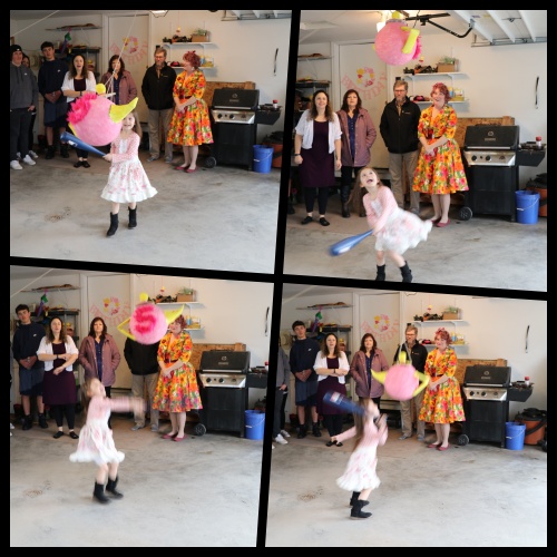 Addy’s mommy made the cake and in the next photo you’ll see the teapot pinata she made with Addy getting the first blows in to try and break it open for all the treats that were inside!