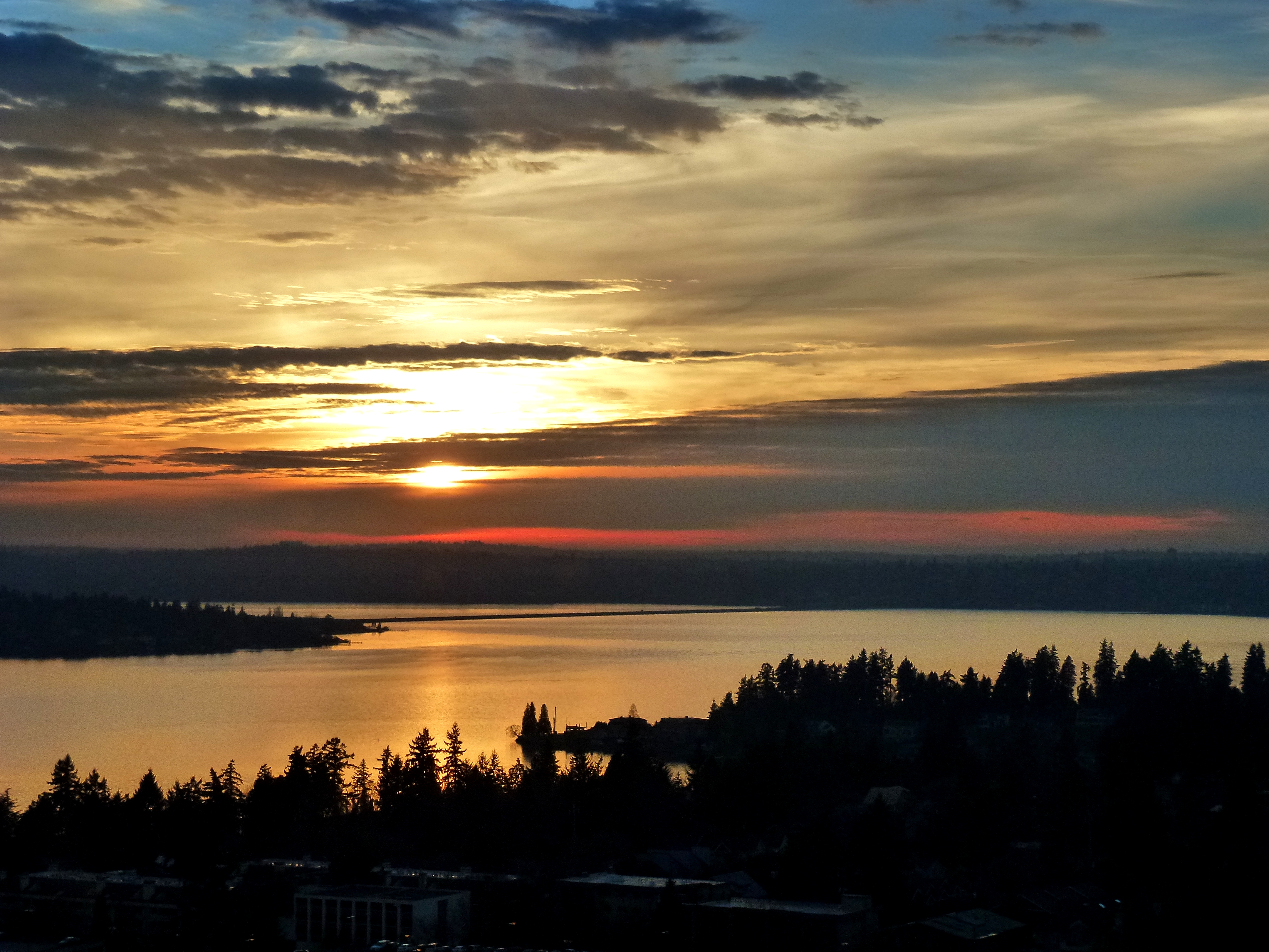 T-Day at Spiros 013There was a cloud layer resting above the Puget Sound and at sunset we got a fun view of the Olympic Mountain range peeking out above the fog with the lovely colors of the sunset above. What you see with the naked eye is very hard to capture with a camera or phone. The view with the eyes God gave me was so much more spectacular than this photo.