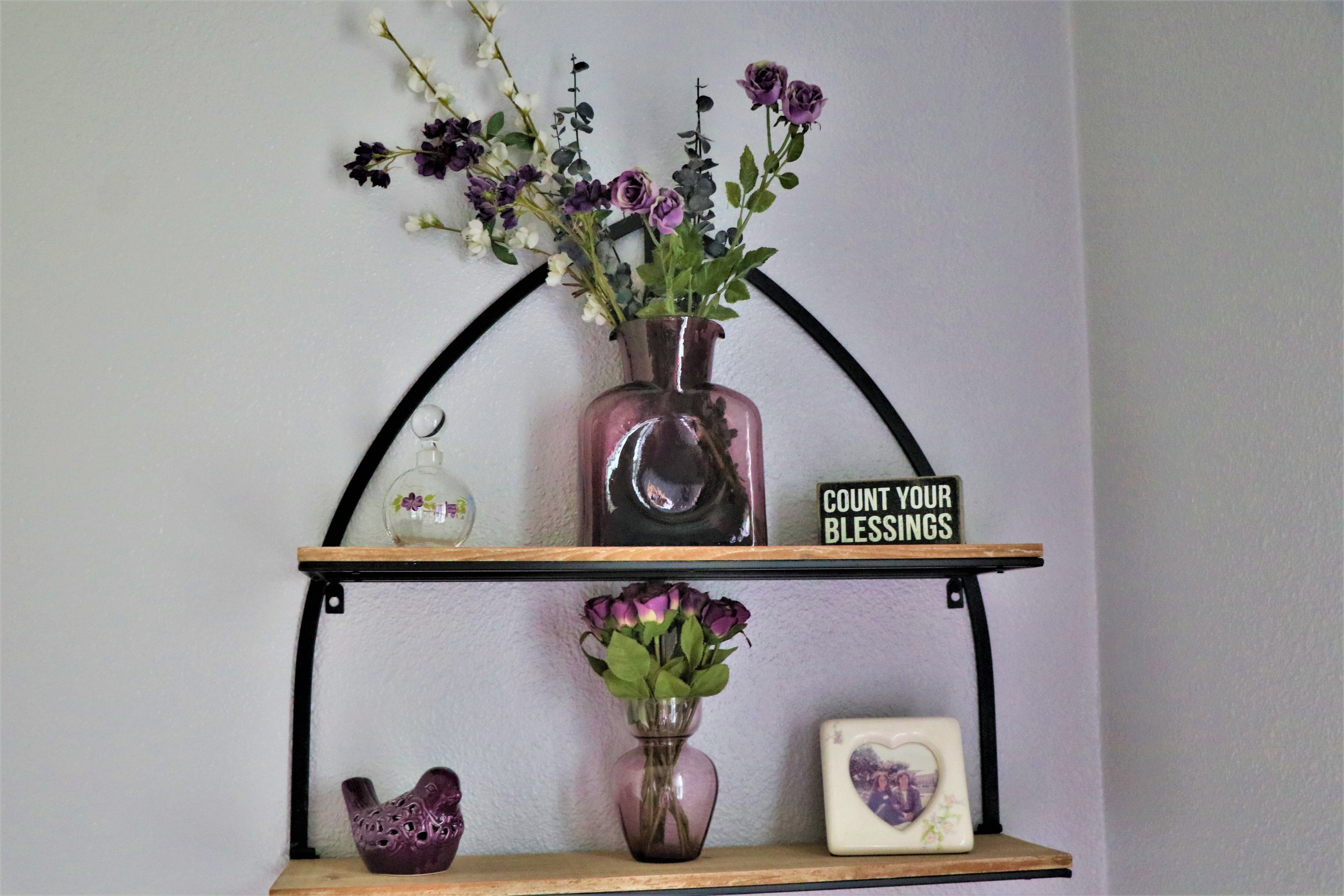 Love is a strong word for what I own that is violet. This is the one display in our home that has some ‘violet’ items on it and it’s above our master bathroom toilet. The photo of me and Dear from 1973 is something I love.
