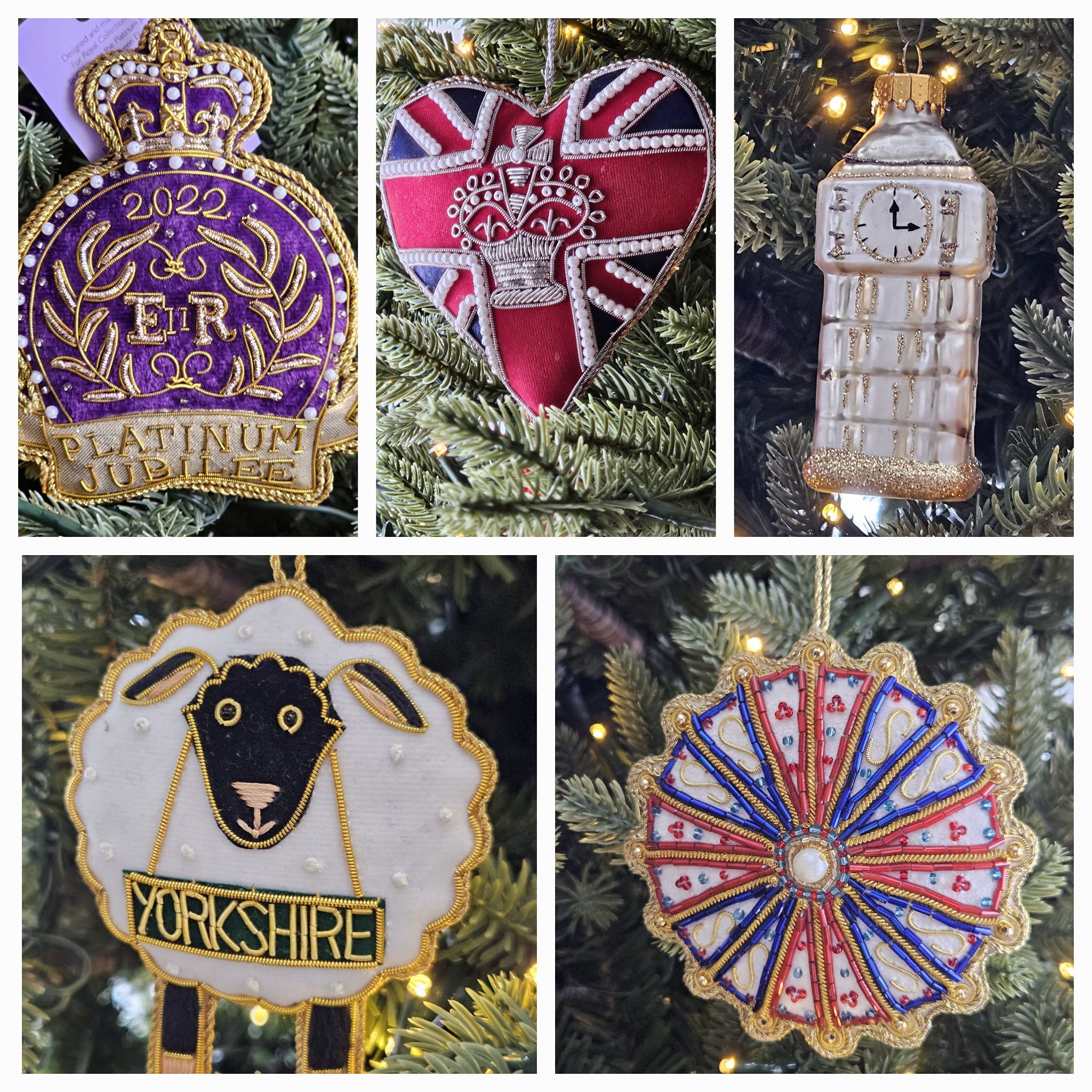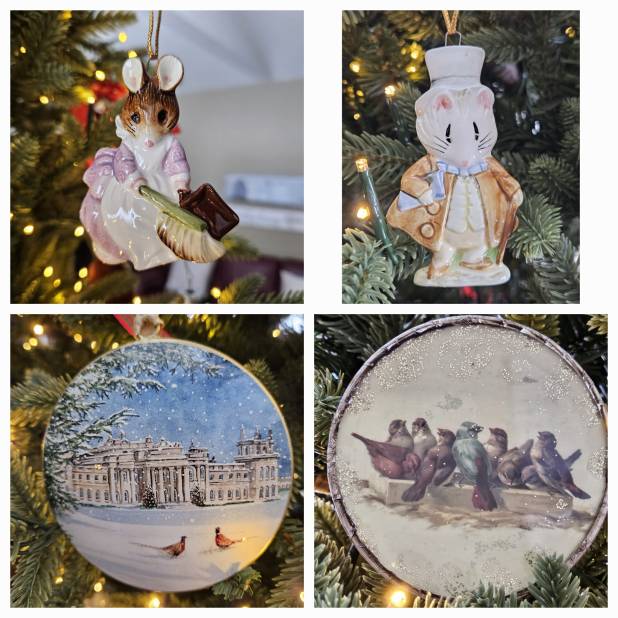 The two Beatrix Potter ornaments and the others are from England except for the birds.
