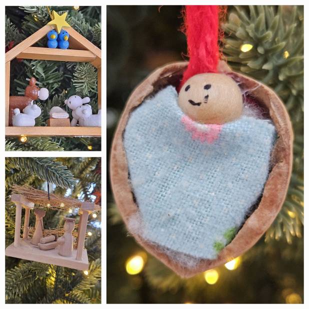 The walnut half with a baby was a Sunday School craft made by one of our kids but I’m unsure which one.
