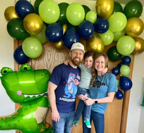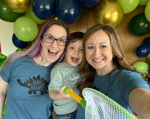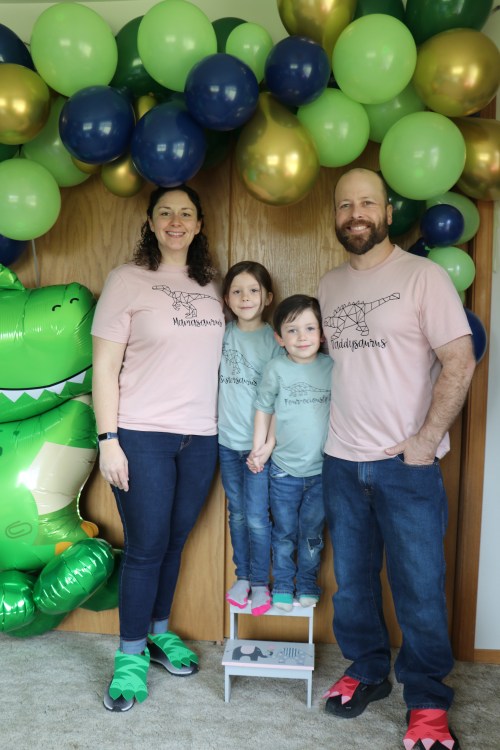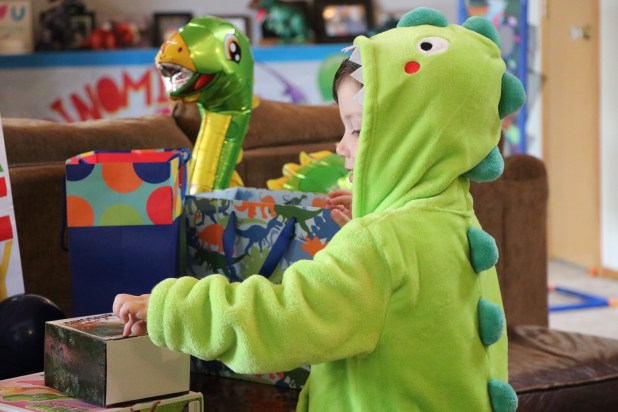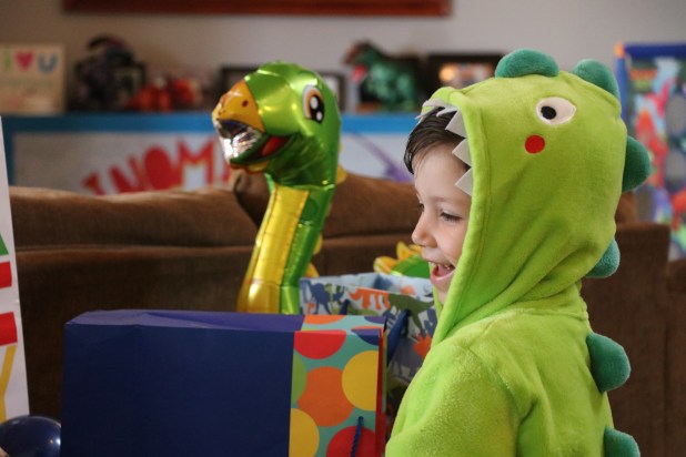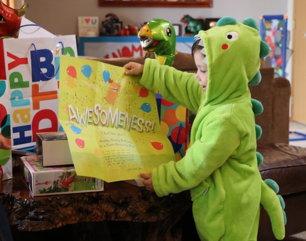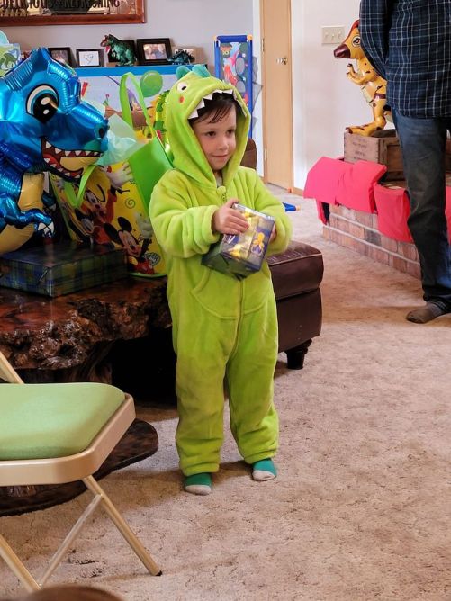 The plan was hatched between the ‘director’ above and the birthday dinosaur to scare all of us with JJ’s ‘scary’ transformation into a green dinosaur.
